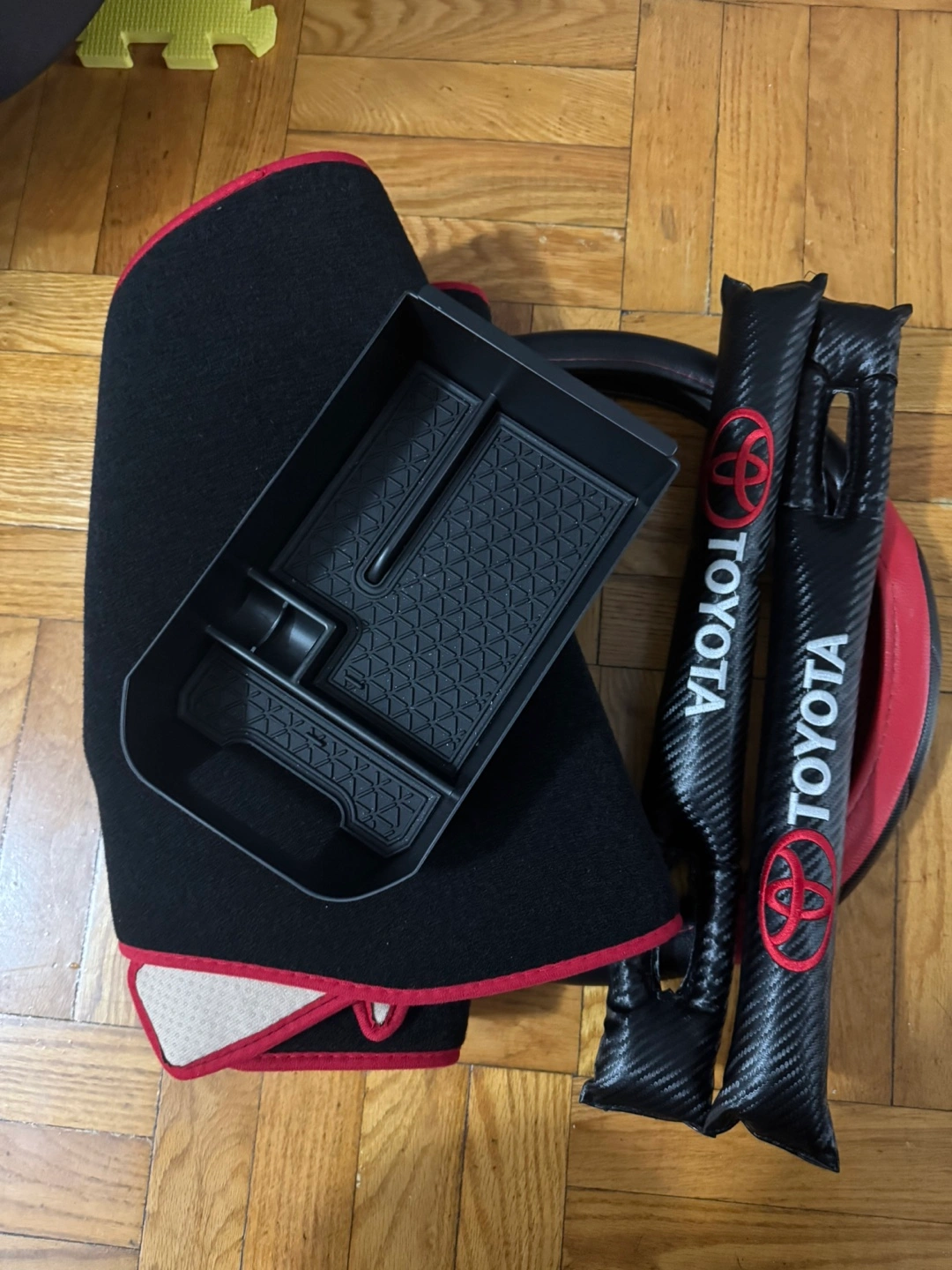 Selling a set of Toyota car accessories! This includes a floor mat with red trim, a centre console organizer tray, and a pair of seat belt covers. They are all in great condition and ready to be used in your Toyota rav4