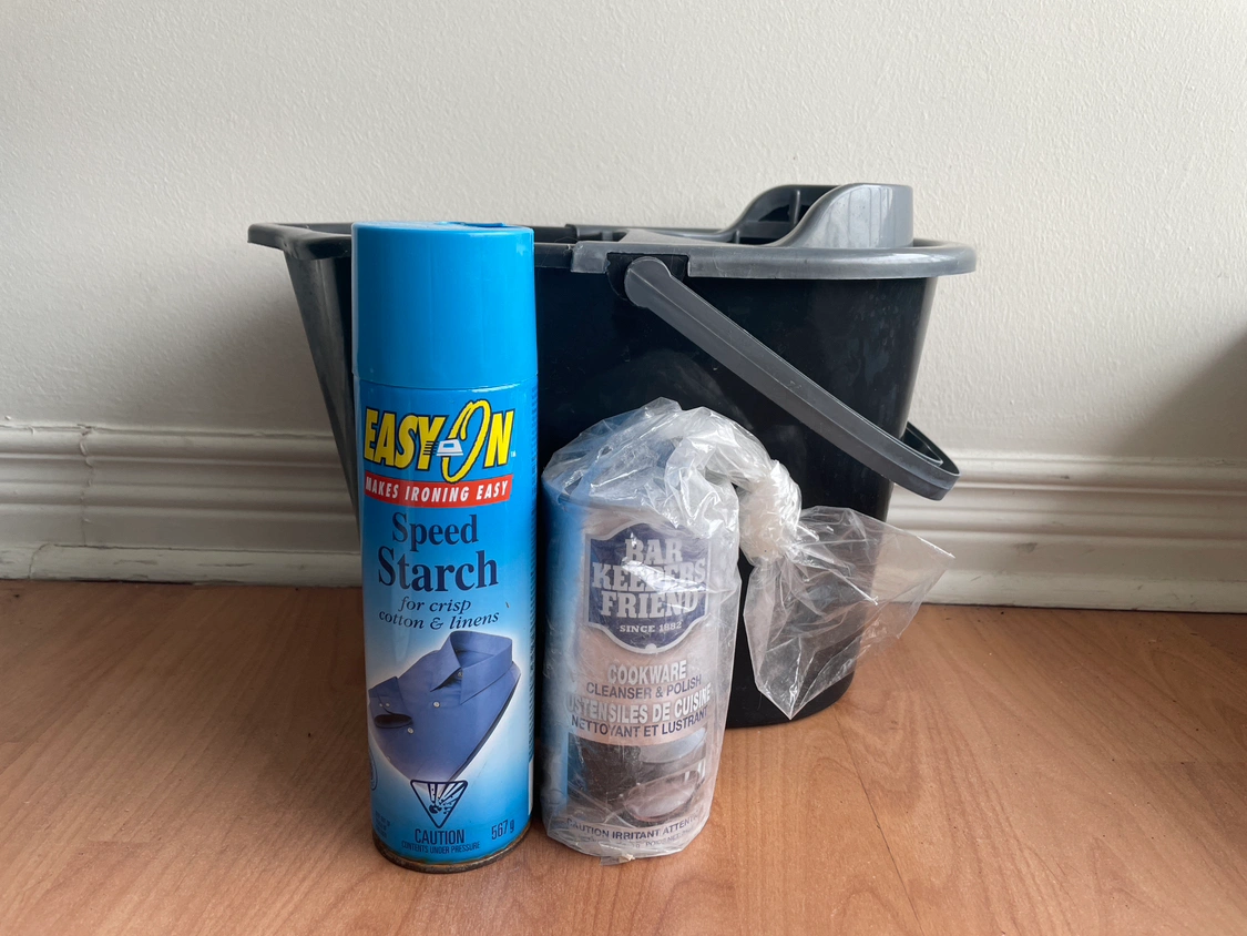 #freecycle bucket, starch spray, cookware polish, dryer sheets