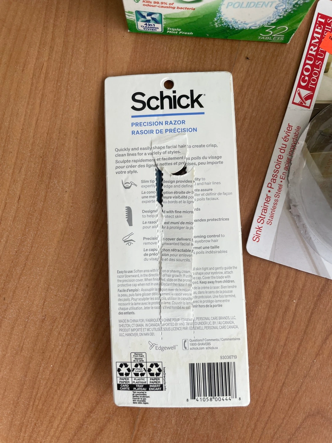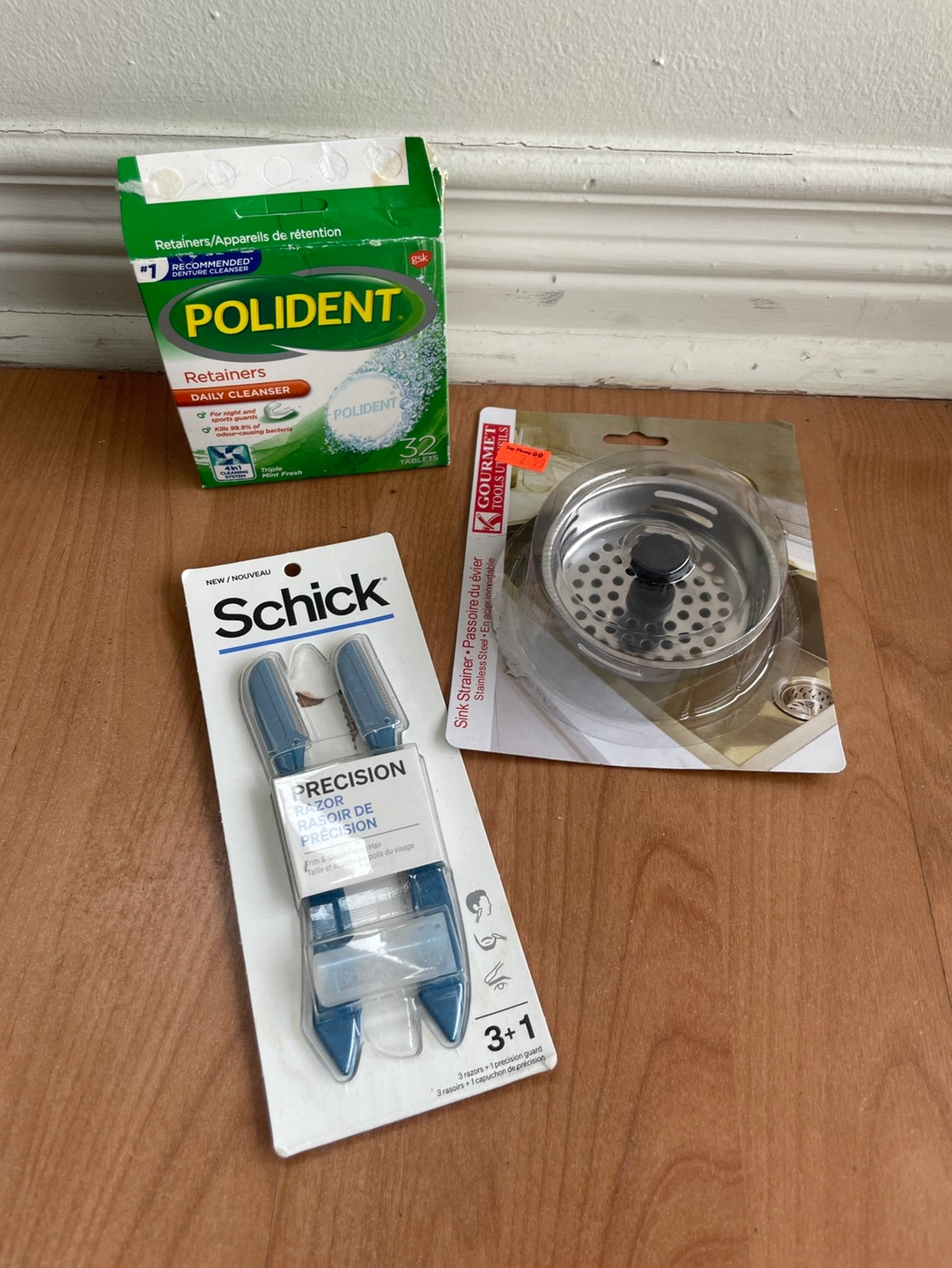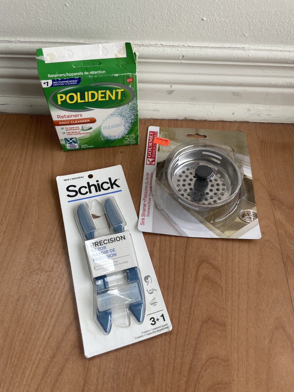 Trying to declutter my apartment. polident daily clenser - opened, 29 tablets left, all still sealed in packets schick precision razors - i used one, not for me, the two left have never been out of the package. sink plug - bought wrong one, opened, but never used. Located near College Park.
