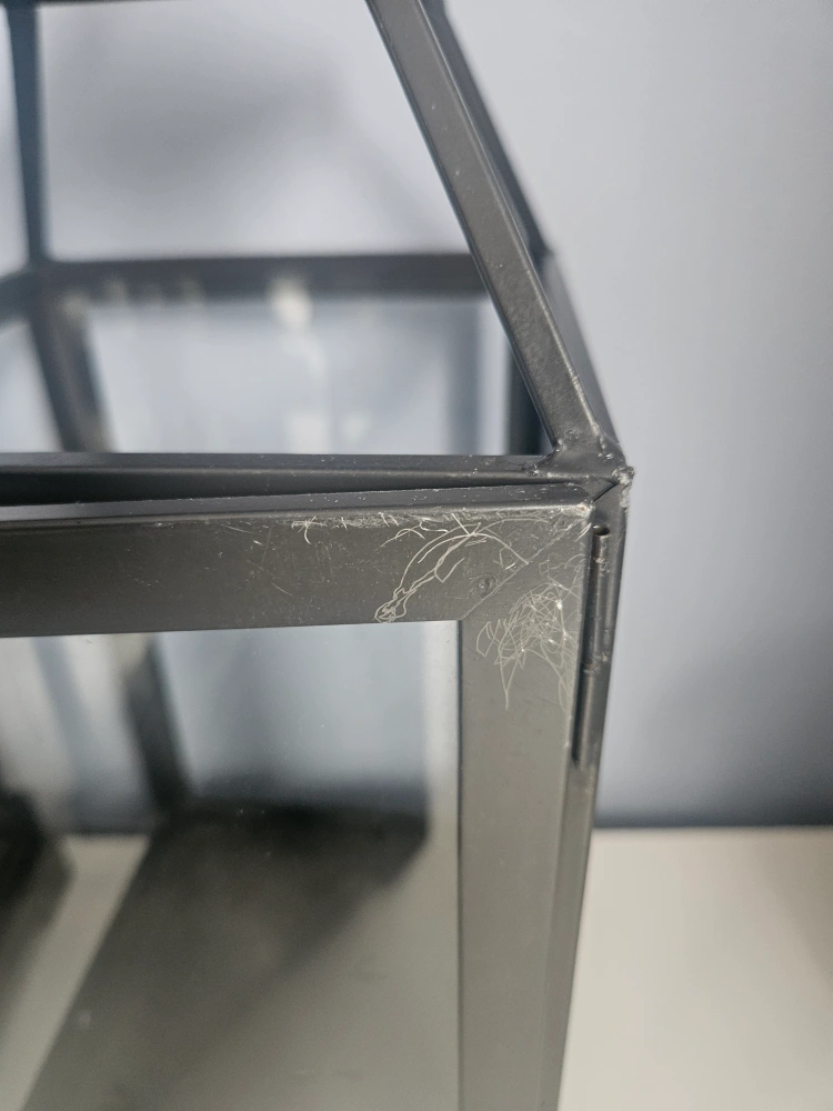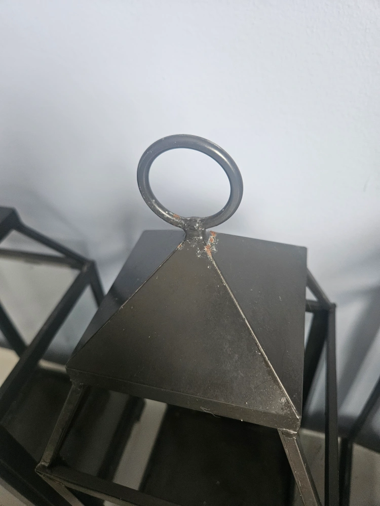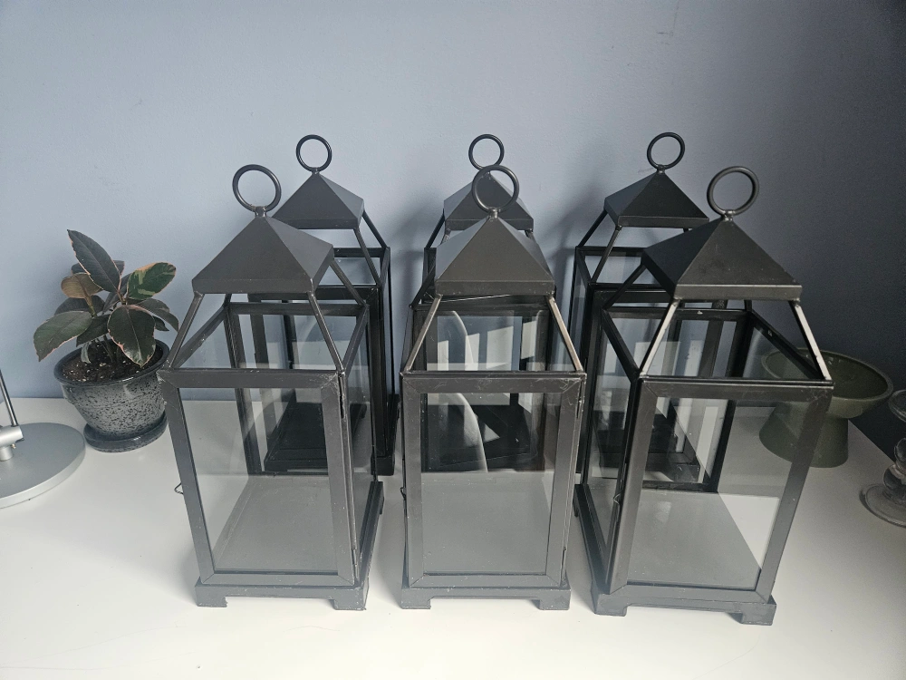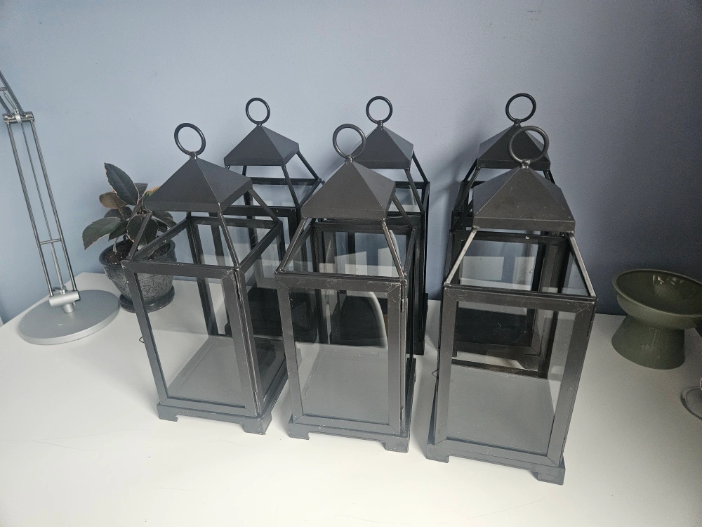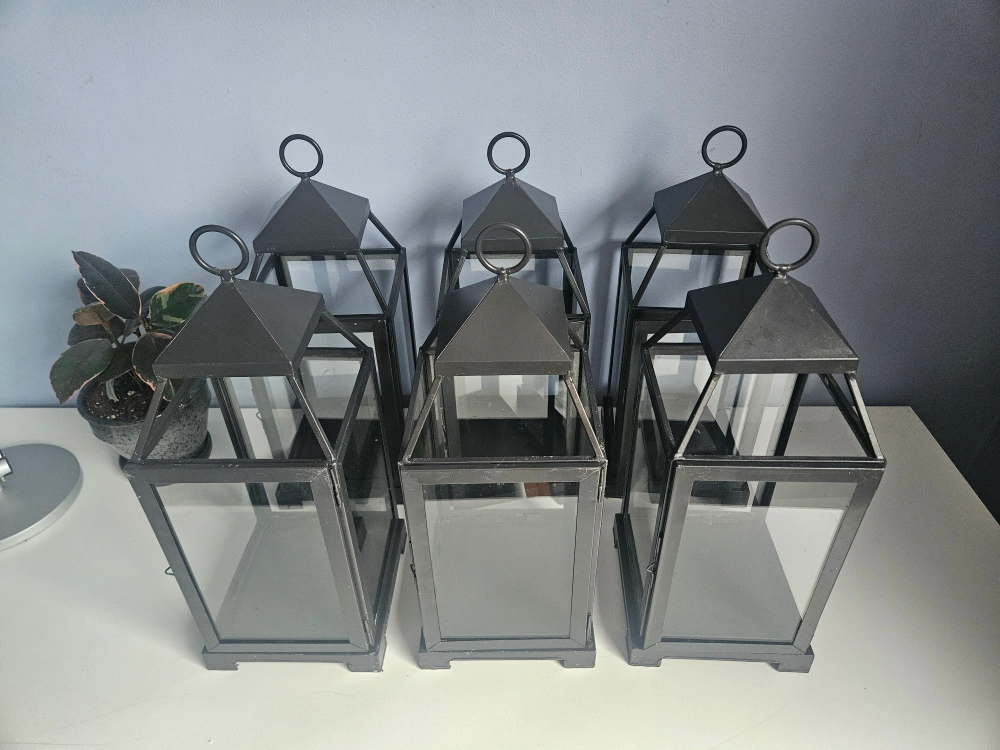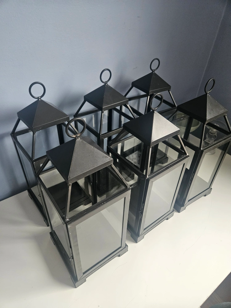 Set of six outdoor candle lanterns from Pottery Barn. 6.5 x 6.5 x 18 inches. In good condition and still look great, however, the doors on two of them do not fully close. There are some minor scratches on some, as seen in pictures, and one has a bit of rust at the top.