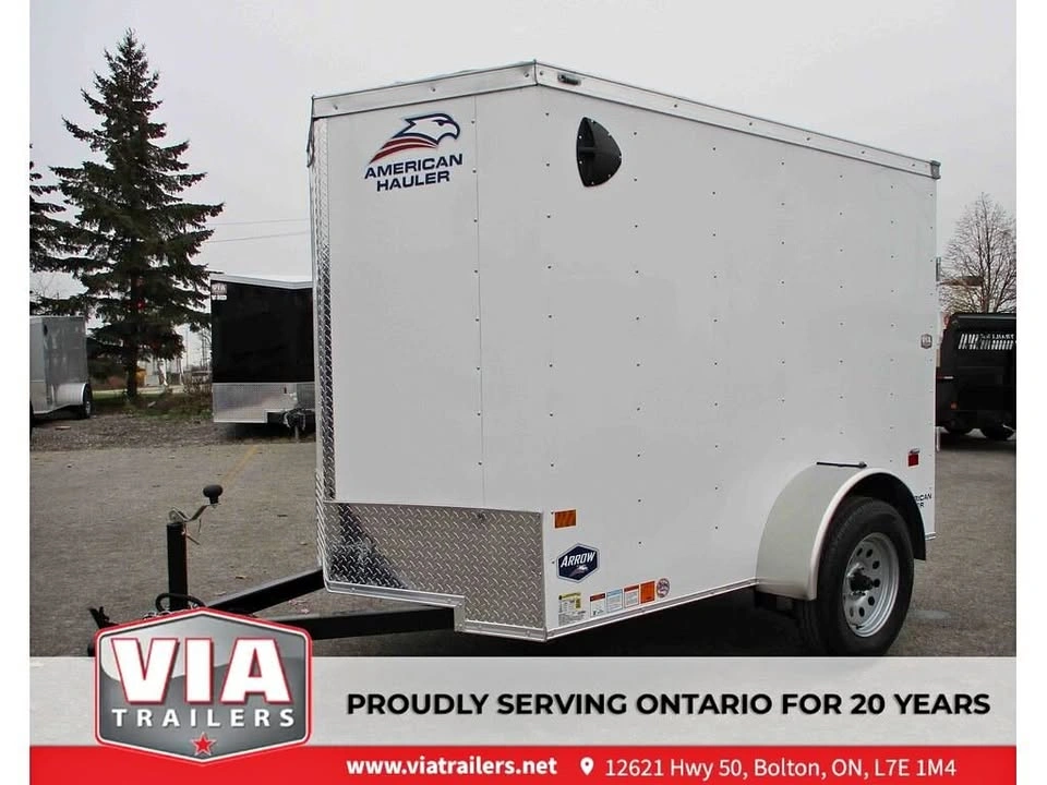 5The American Hauler ARROW is your path to dependable and low-maintenance cargo hauling that won’t break the bank. It’s a perfect fit for recreational and light-duty applications. Although classified as an “entry level” trailer, the ARROW is loaded with quality features found on much more expensive trailers. No matter your hauling needs . . . count on the ARROW to deliver your valuables safe and secure to your final destination. STANDARD FEATURES Spring Axle with E-Z Lube® Hubs Smooth Aluminum Radius Fenders 3/4'' PlexCore Interior Floor Chassis Z-Tech Undercoated Flat Roof Lauan Interior Sidewalls 1 Piece Aluminum Roof 15'' Radial Tires 1-Year Limited Warranty 4'' Drop Axles .024 Black, White or Pewter Aluminum 12v LED Dome Light (1) with Self Switch Radial Tires 32'' Side Door with Bar Lock (no side door on 5'W models) 16'' Starbright Stoneguard Rear Ramp Door with Flap (Single Swing Door on 5'W models) Silver Mod Wheels 24'' OC Roof Bows 24'' OC Crossmembers 16'' OC Sidewall Posts Electric Brakes with Breakaway Kit (Tandem Axle Models) Safety Chains Ball Coupler Hitch 500 lb. Surface Wall Mounted Rope Rings (4) Via Trailers has been in the trailer business for over 20 years. We pride ourselves on service and customer satisfaction is our primary goal and this continues after the sale as well. Our full-service shop can handle most repairs including panel repair, welding, and electrical fixes all the way to full MTO safety inspections and any warranty issues that may come up during coverage. Via Trailers stocks almost all sizes with varying trim levels, if you want an entry level unit or a fully finished car hauler, we should have you covered. We offer multiple brands and models to choose from. Our current brands are Middlebury Trailers (MTI), Weberlane, Continental Cargo, American Hauler, Pace, Alcom, Bravo, ATC, Triumph and One Sixteen. We are proud to serve the GTA, Vaughan, Markham, Richmond Hill, Brampton, Mississauga, Oakville, Hamilton, Burlington, Niagara Region, St. Catherines, Bradford, Bolton, King City, Stouffville, Kawartha Lakes, Barrie, Orillia, Sudbury, Sarnia, Owen Sound and so many more. Our trailers are everywhere. See if you can spot our logo on a trailer next time you are on the road, I bet it wont take long! If you are looking for a new trailer, a used trailer, a custom trailer, safety inspections, repairs, or an annual service Via Trailers is a one stop shop for all your trailer needs. Come see us today and let’s make a deal!