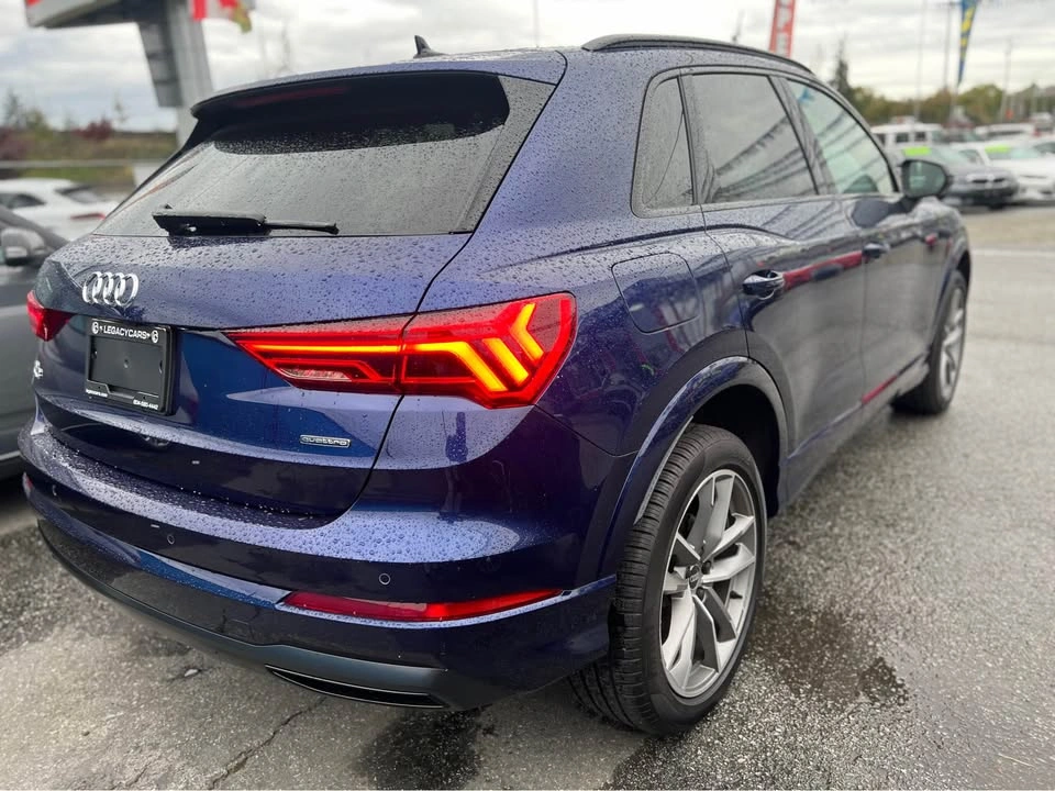 60FOR SALE: 2024 Audi Q3 Komfort 40 TFSI Quattro in Navarra Blue Metallic with tan leather interior. Only 7,001 km. No accidents, BC local. Vehicle Highlights: Year: 2024 Make: Audi Model: Q3 Komfort 40 TFSI Quattro Exterior Color: Navarra Blue Metallic Interior: Tan Interior Leather Mileage: 7,001 km Drivetrain: All-Wheel Drive (quattro) Transmission: 8-Speed Automatic Engine: 2.0L TFSI Turbocharged I4 Key Features: Audi quattro All-Wheel Drive Panoramic sunroof Heated front seats & heated steering wheel Apple CarPlay & Android Auto MMI infotainment system with touchscreen display Dual-zone automatic climate control Power liftgate Rearview camera & parking sensors LED headlights & taillights Peace of Mind: Low mileage Balance of Audi factory warranty Fully inspected Price: $41,998 + taxes & fees Call or Text Paul