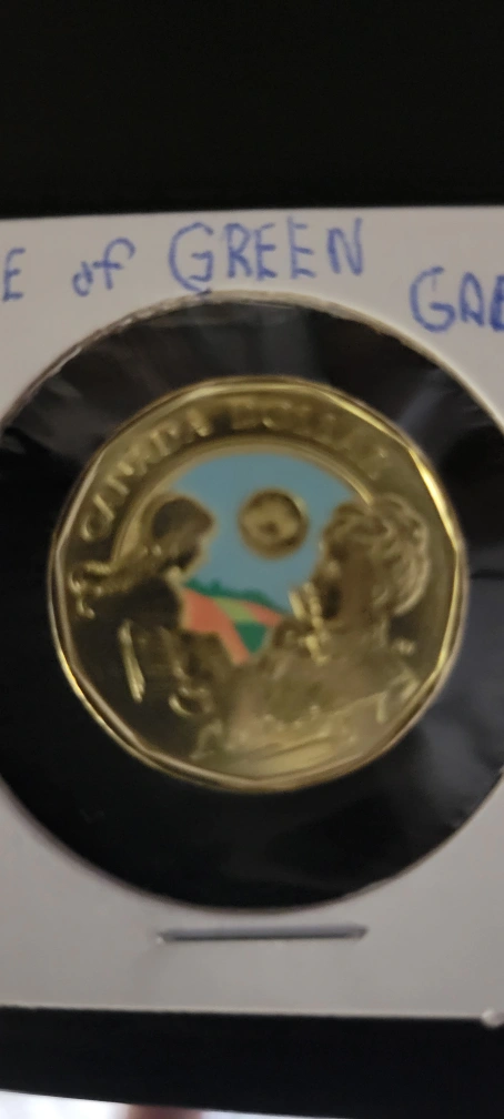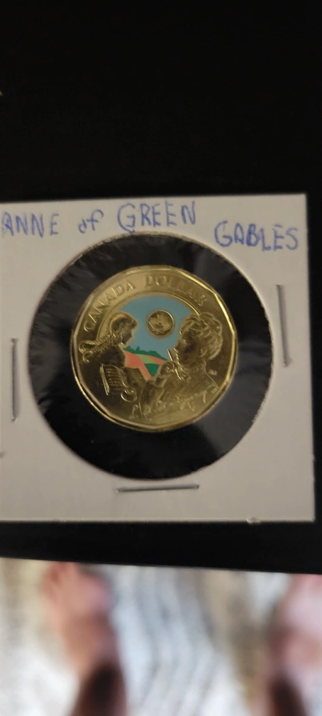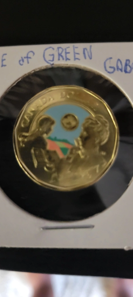 Canadian $1 coin featuring Anne of Green Gables. The coin depicts Anne and LM MONTGOMERY. reading