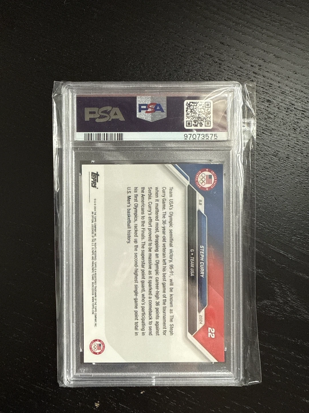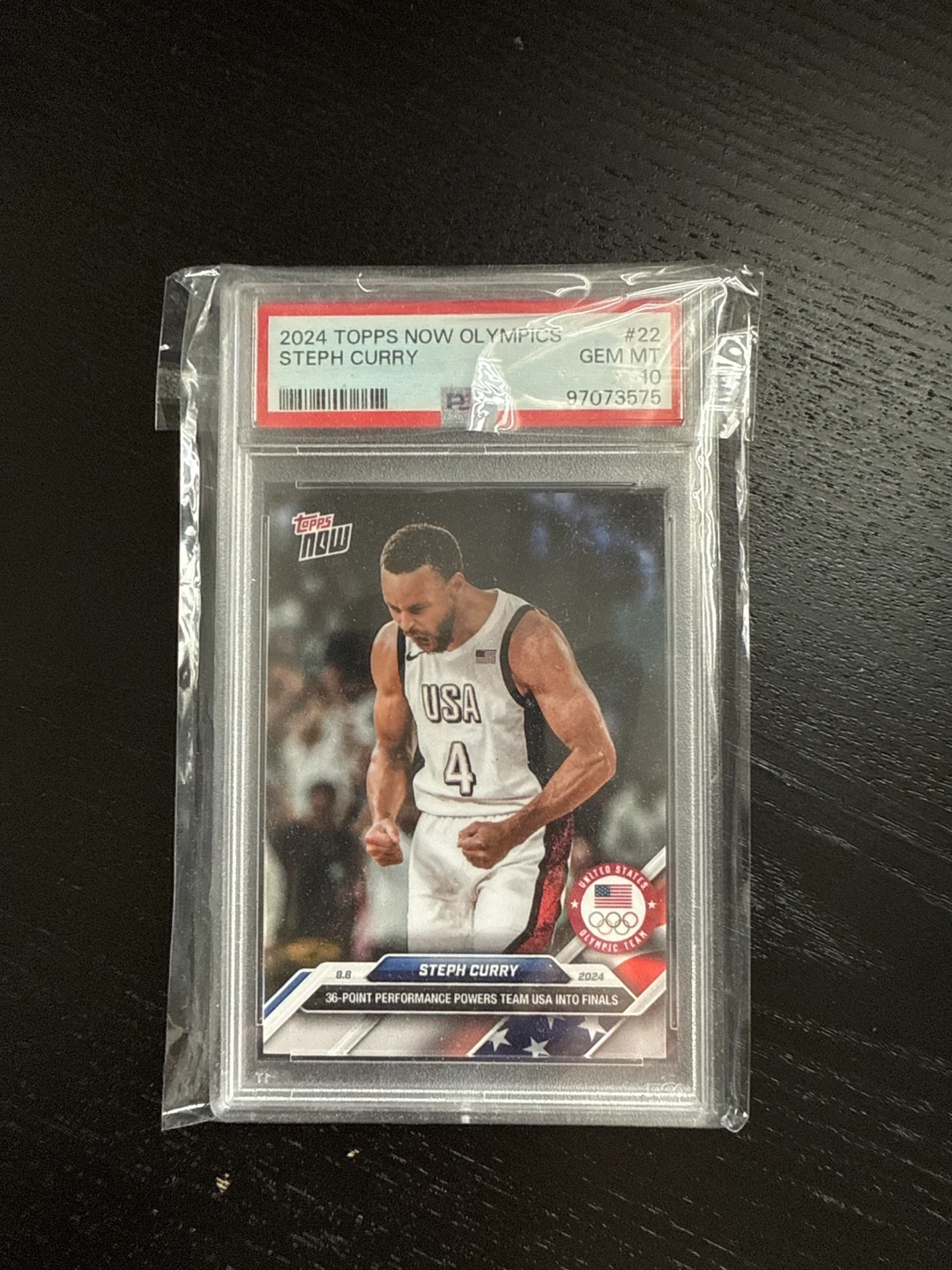 Selling a 2024 Topps Now Olympics Steph Curry card, graded GEM MT 10 by PSA. Card #22.