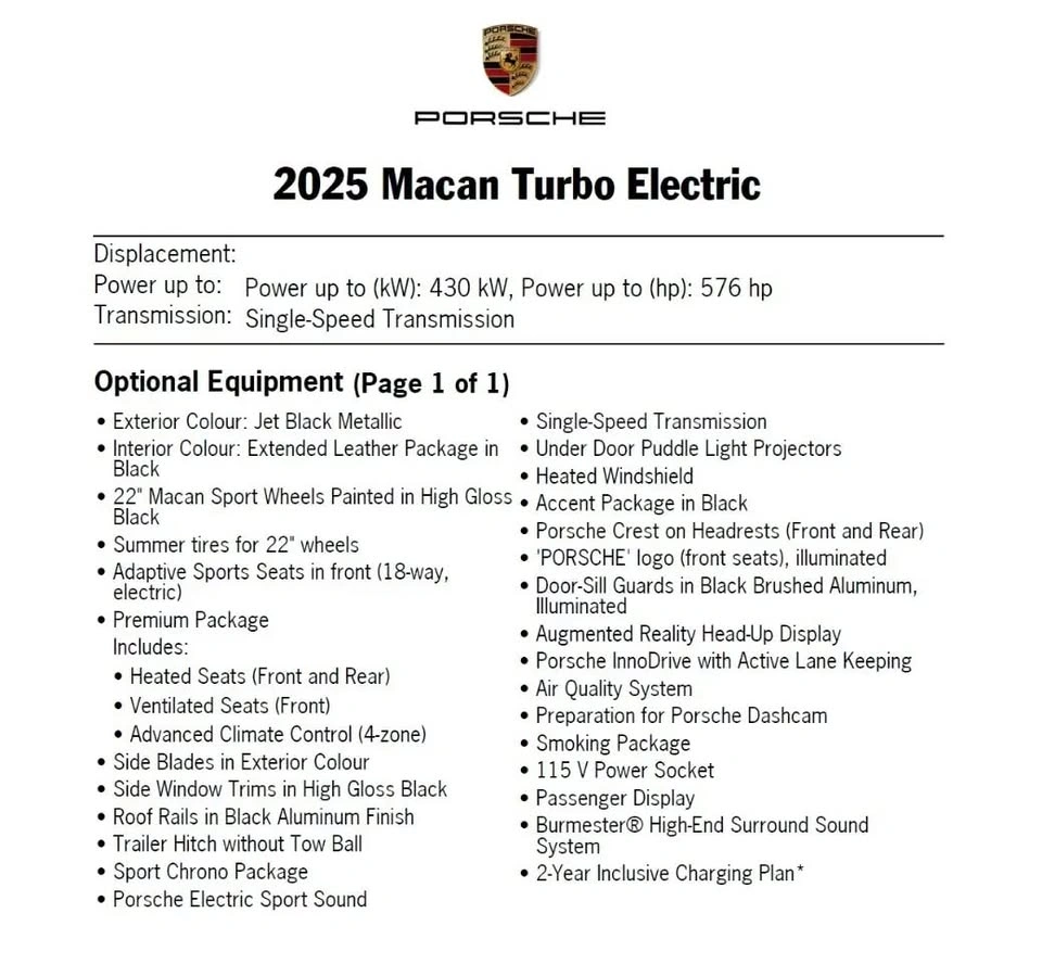 752025 Porsche Macan – Jet Black Metallic, Extended Leather Package, Fully Loaded ✨ Optional Equipment & Highlights: Exterior Colour: Jet Black Metallic Interior: Extended Leather Package in Black Wheels: 22" Macan Sport Wheels (High Gloss Black) + summer tires Seats: Adaptive Sports Seats (18-way, electric) with Porsche Crest on headrests Premium Package: heated front & rear seats, ventilated front seats, 4-zone advanced climate control Sport Chrono Package + Porsche Electric Sport Sound Roof Rails in Black Aluminum, Side Blades in Body Colour, Side Window Trims in High Gloss Black Luxury Touches: illuminated Porsche logo on seats, under-door puddle lights, illuminated door-sill guards in brushed aluminum Technology: AR head-up display, Porsche InnoDrive w/ Active Lane Keeping, passenger display, 115V power socket, prep for Porsche Dashcam Audio: Burmester® High-End Surround Sound System Convenience: trailer hitch (no tow ball), heated windshield, Air Quality System, Smoking Package 2-Year Inclusive Charging Plan ✅ 178-Point Full Safety Inspection completed ✅ Fully loaded with premium factory options Call or text Kaveh at 604*353*5857 to make an appointment (by appointment only). Price subject to $795 dealer prep fee + taxes. DL# 40269.