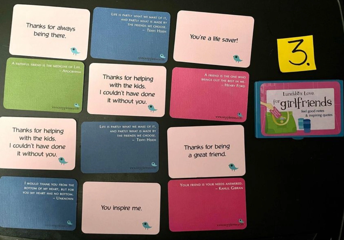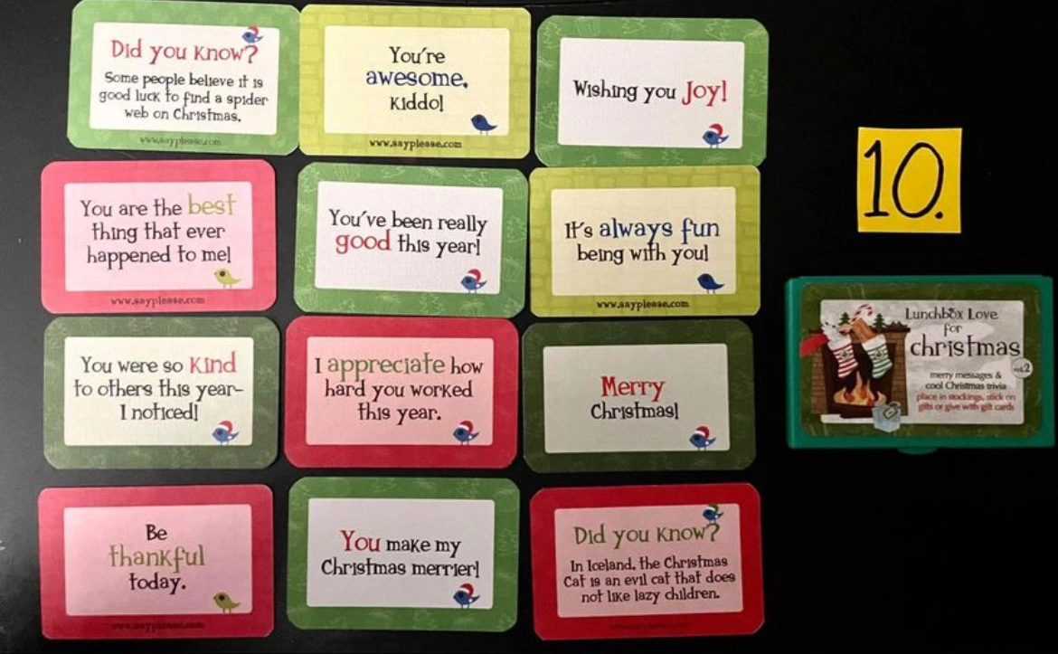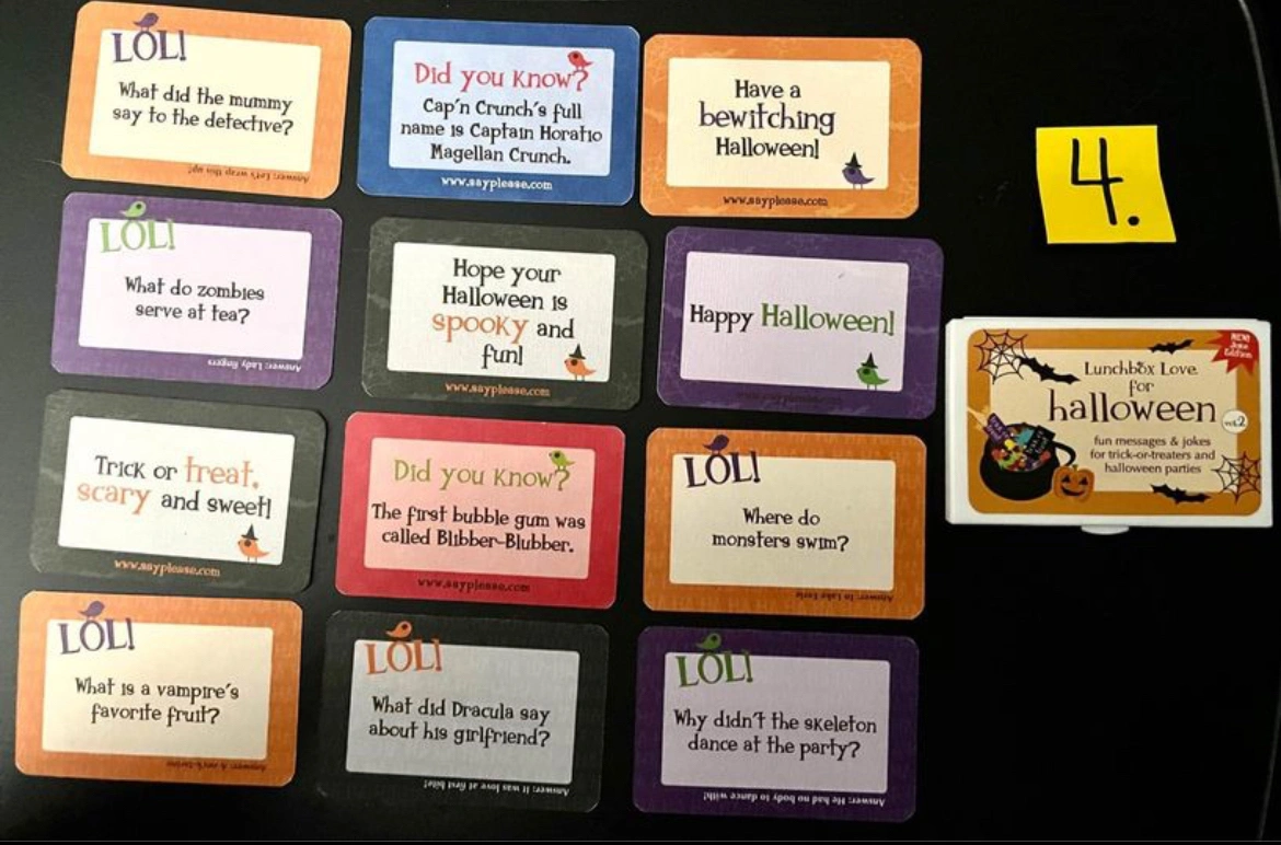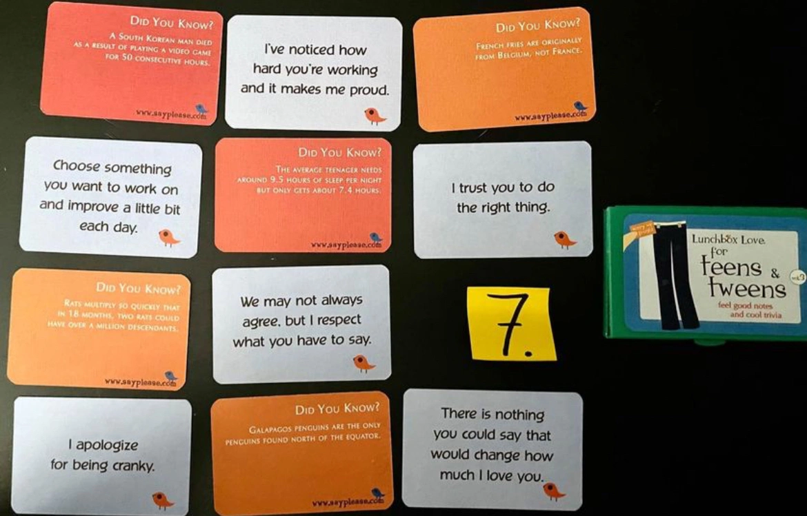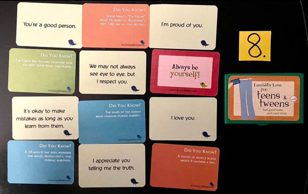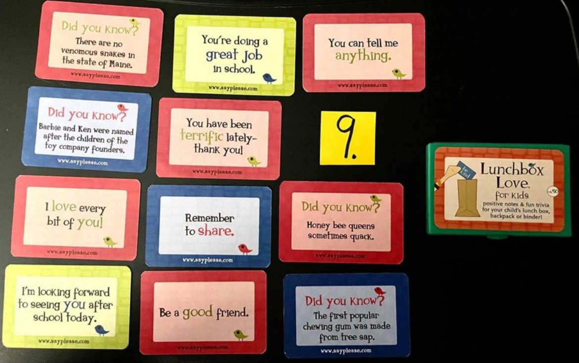 - All of the cards have positive, heartfelt messages on the front and fun facts, corny jokes, or riddles that kids & adults love on the back as a way of connecting when you’re not there.