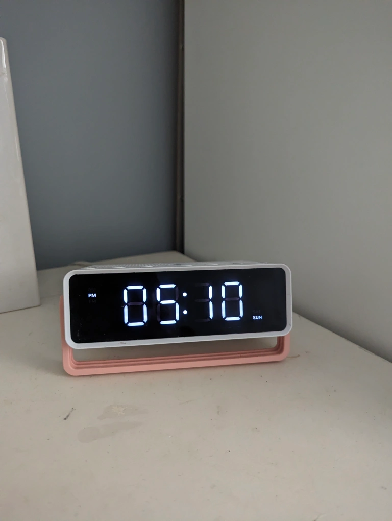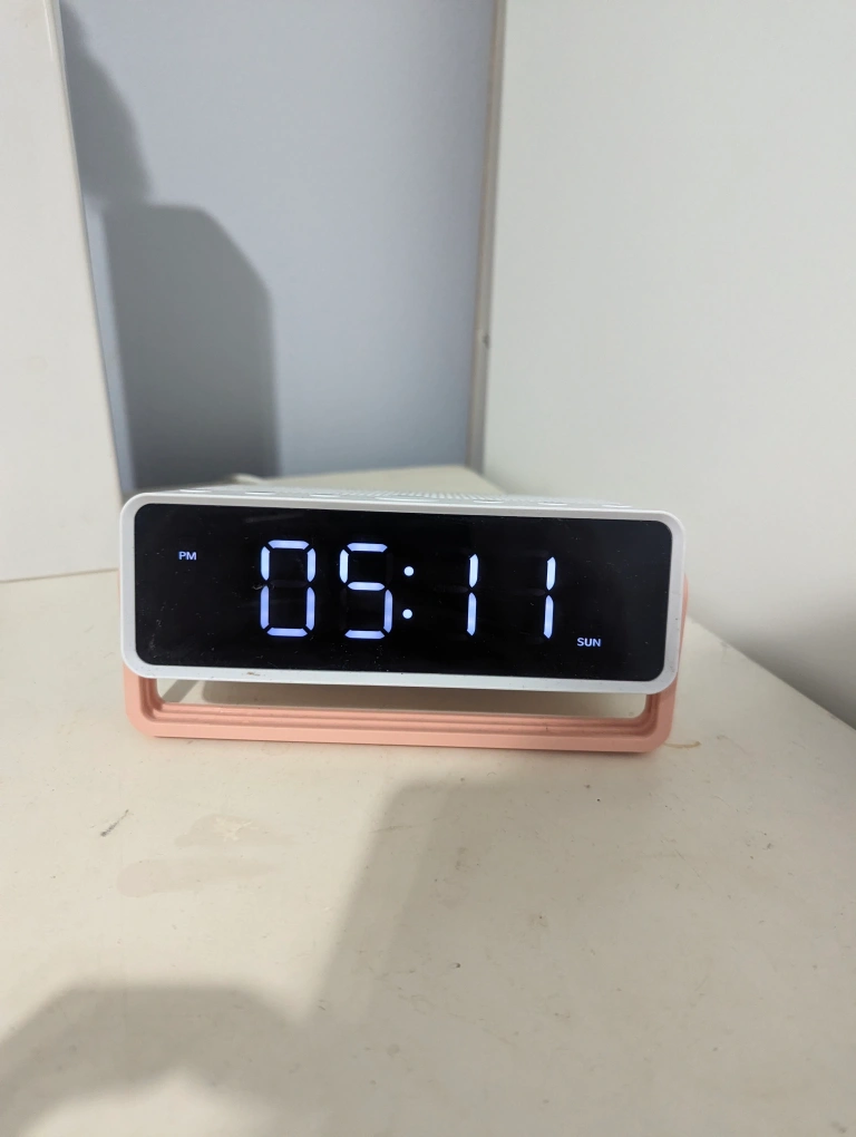 Digital alarm table clock that works on cell or USB. It can play music and connects through Bluetooth and has Radio FM.