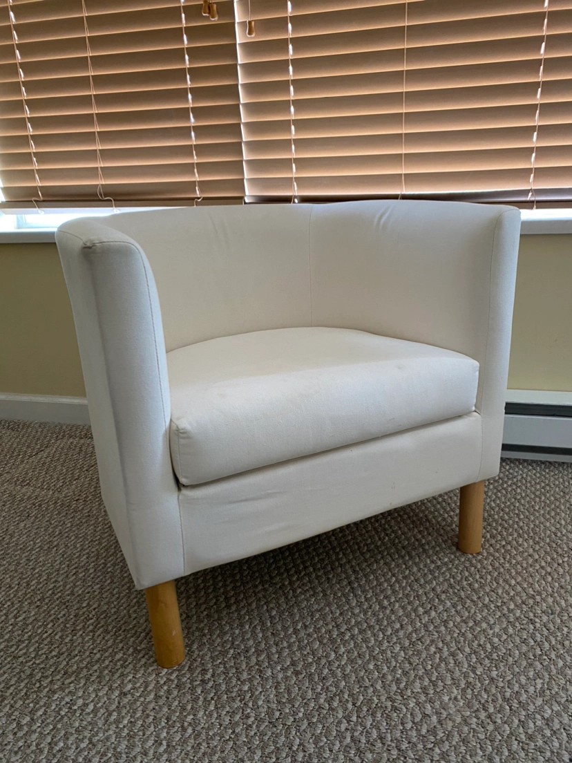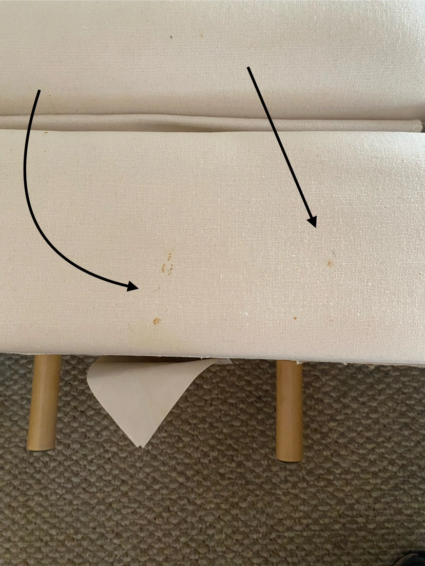 Upholstered in unbleached cotton. Has a couple of stains that could probably be steam-cleaned out.