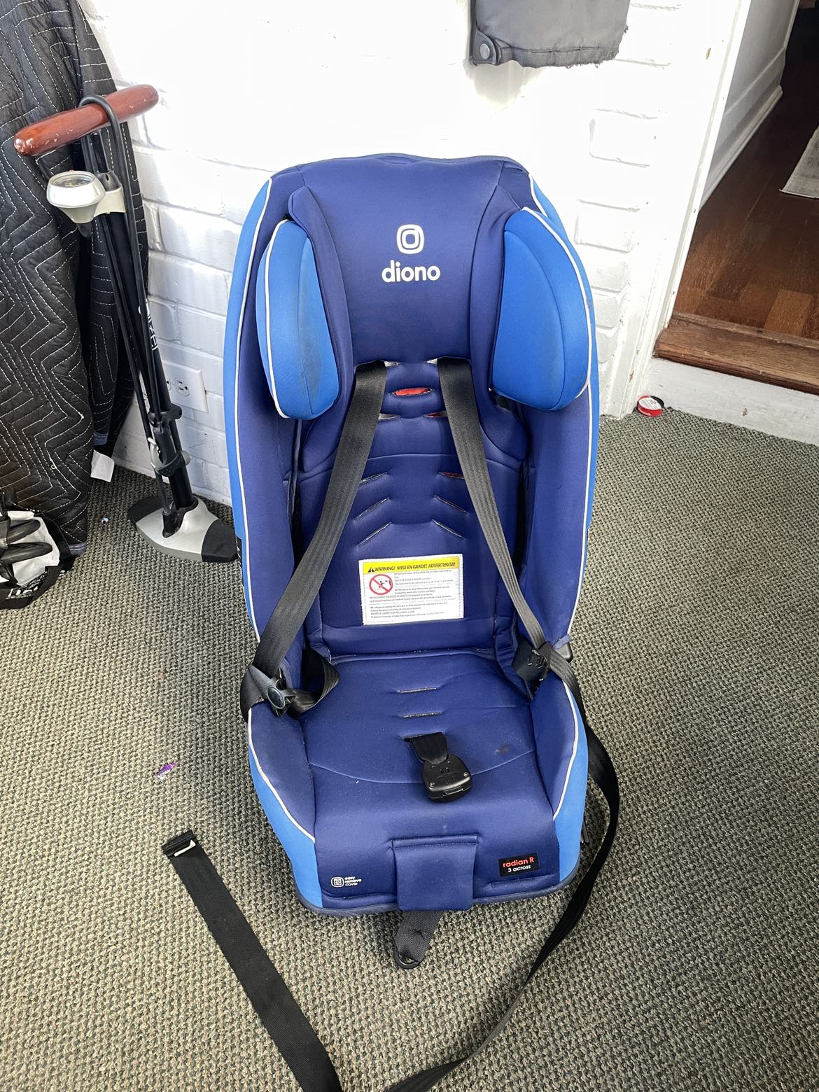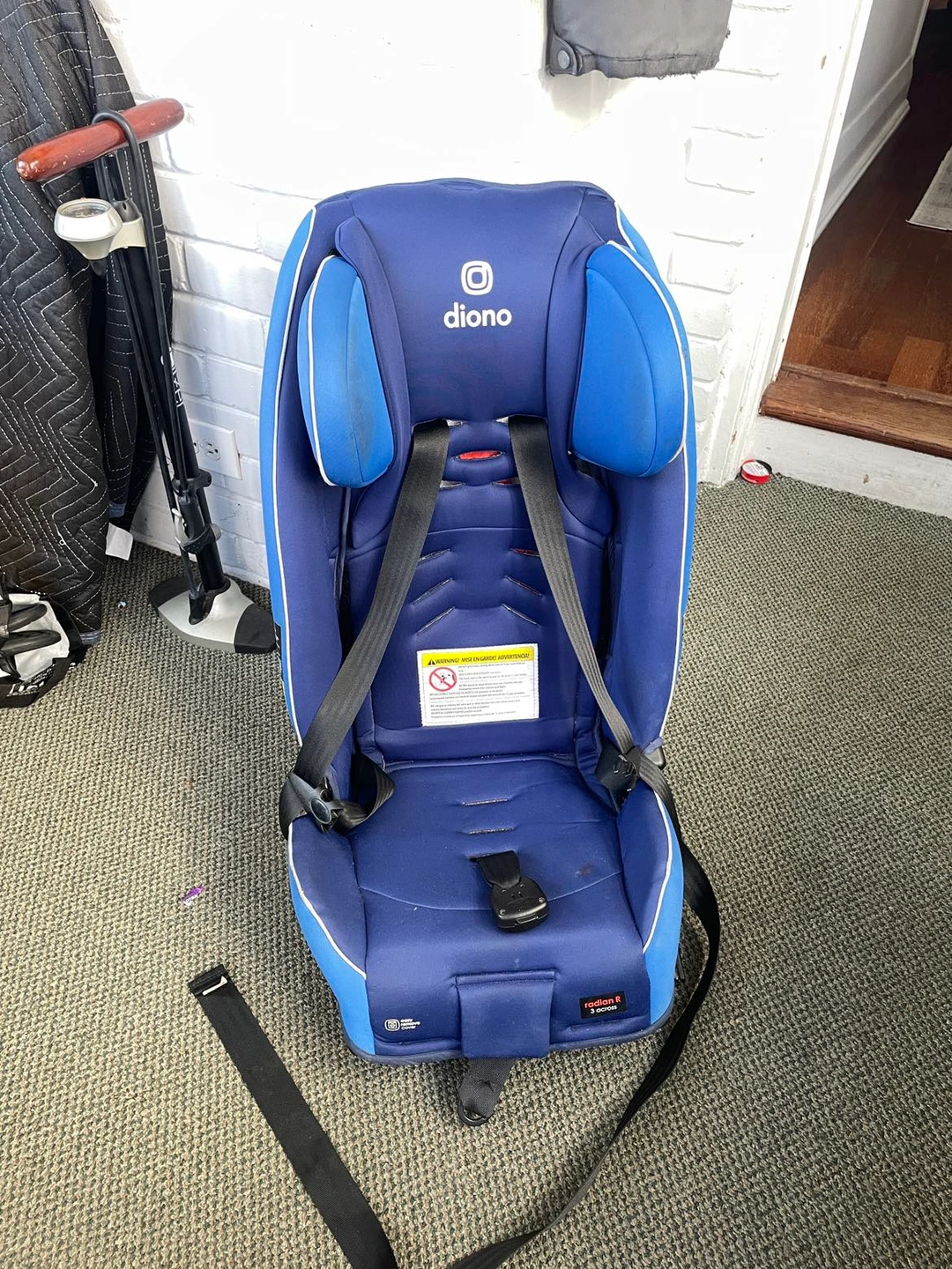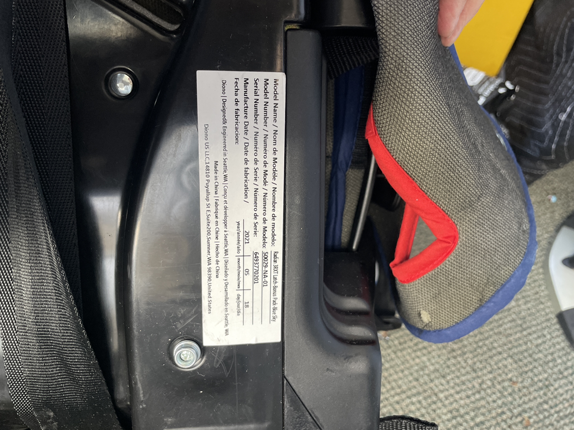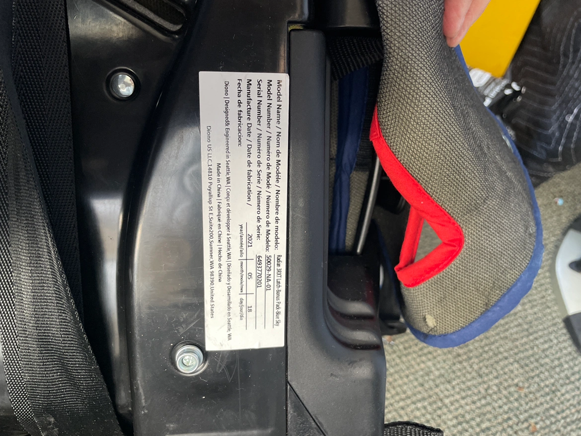 Purchased in late 2021 and used until March 2024. My babe outgrew this car seat. Missing the infant portion as it was only used as a car seat and booster. In very good condition. No accidents. A couple of stains that can be washed as the fabric part is removable.