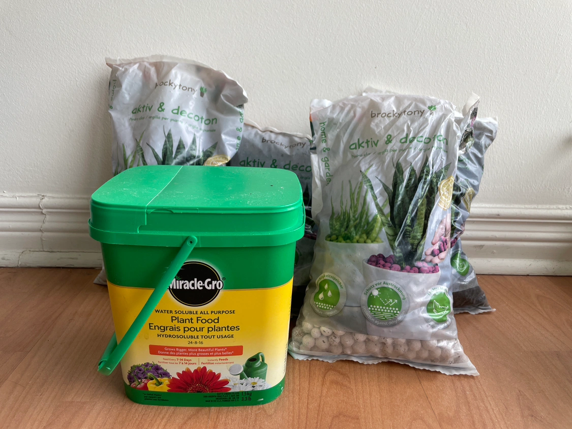 miracle grow - comes in container, three seperate bags, two sealed, one open with about a 1/2 gone, measuring scoop