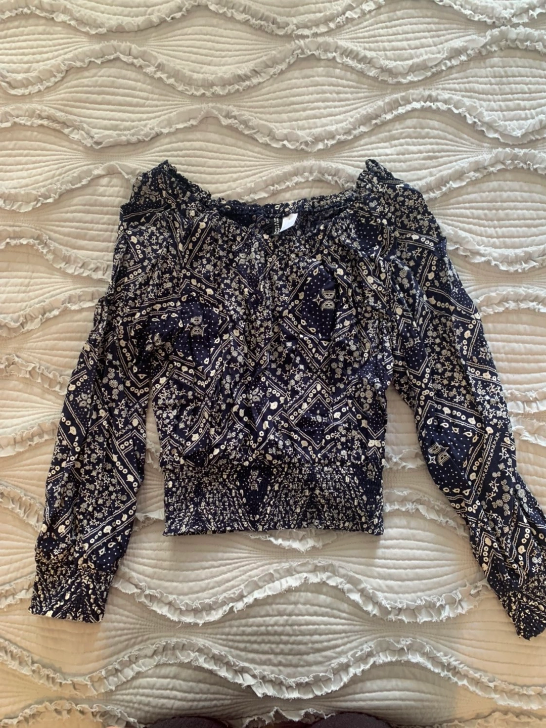 Off shoulder with elastic around neckline, cuffs and waist.