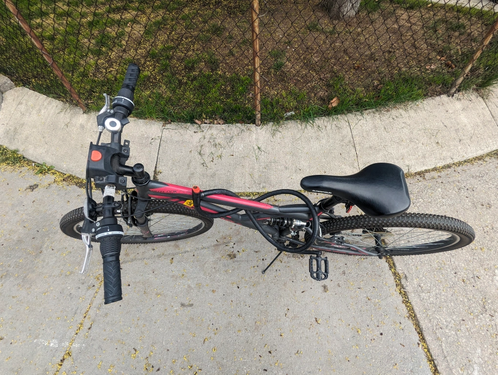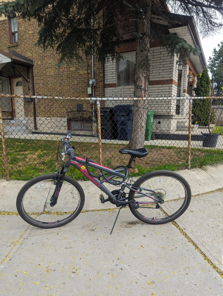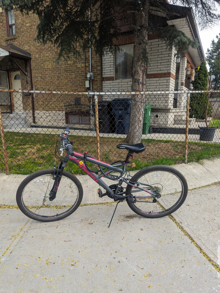 Supercycle Outlook Dual Suspension Mountain Bike with lock and helmet, looking for a new home as I am moving out. I got this from Canadian Tire, it is comfortable to ride around the city and for a hike and in great shape.