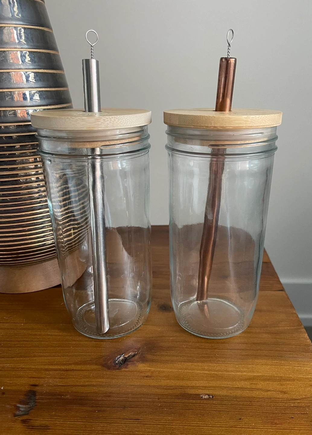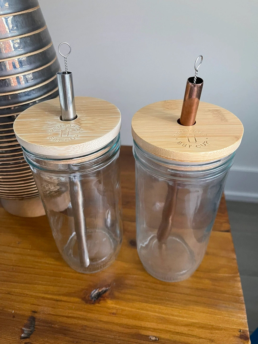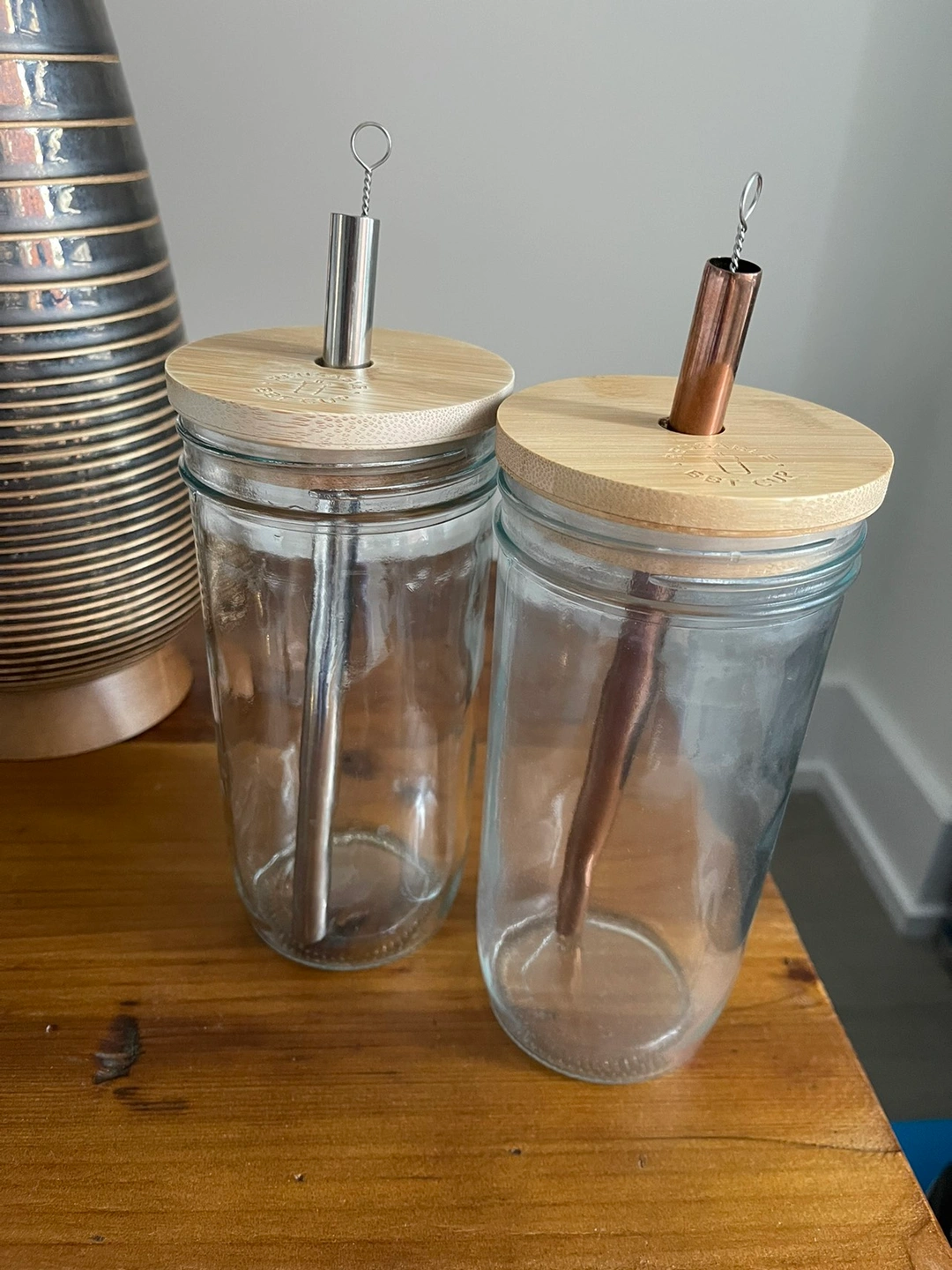 Gently used set of 2 reusable glass bubble tea cups with straw and cleaner included. Can also be used to enjoy any cold drinks! Originally paid $60 with taxes and shipping. Buy 2 for $40 or $25/each