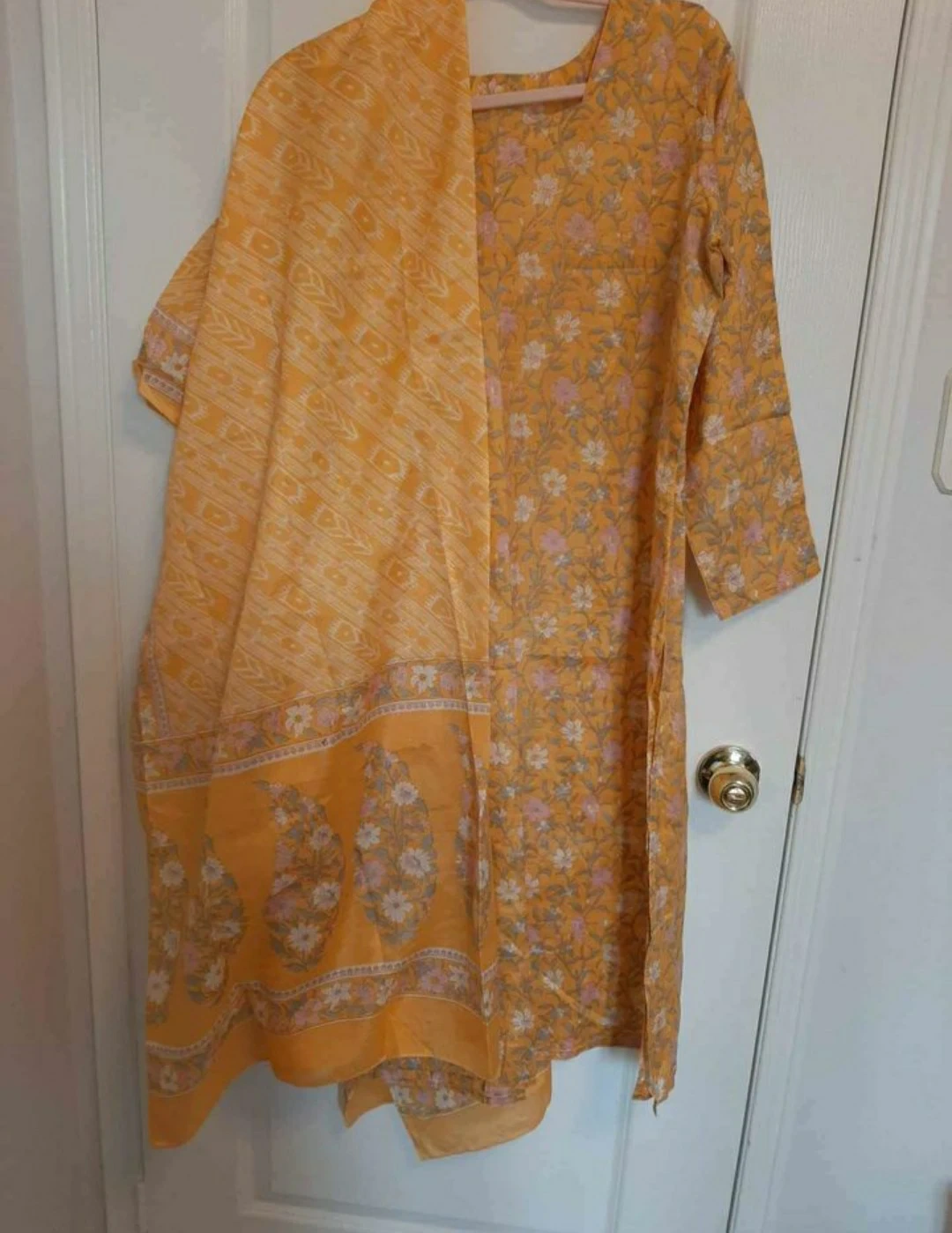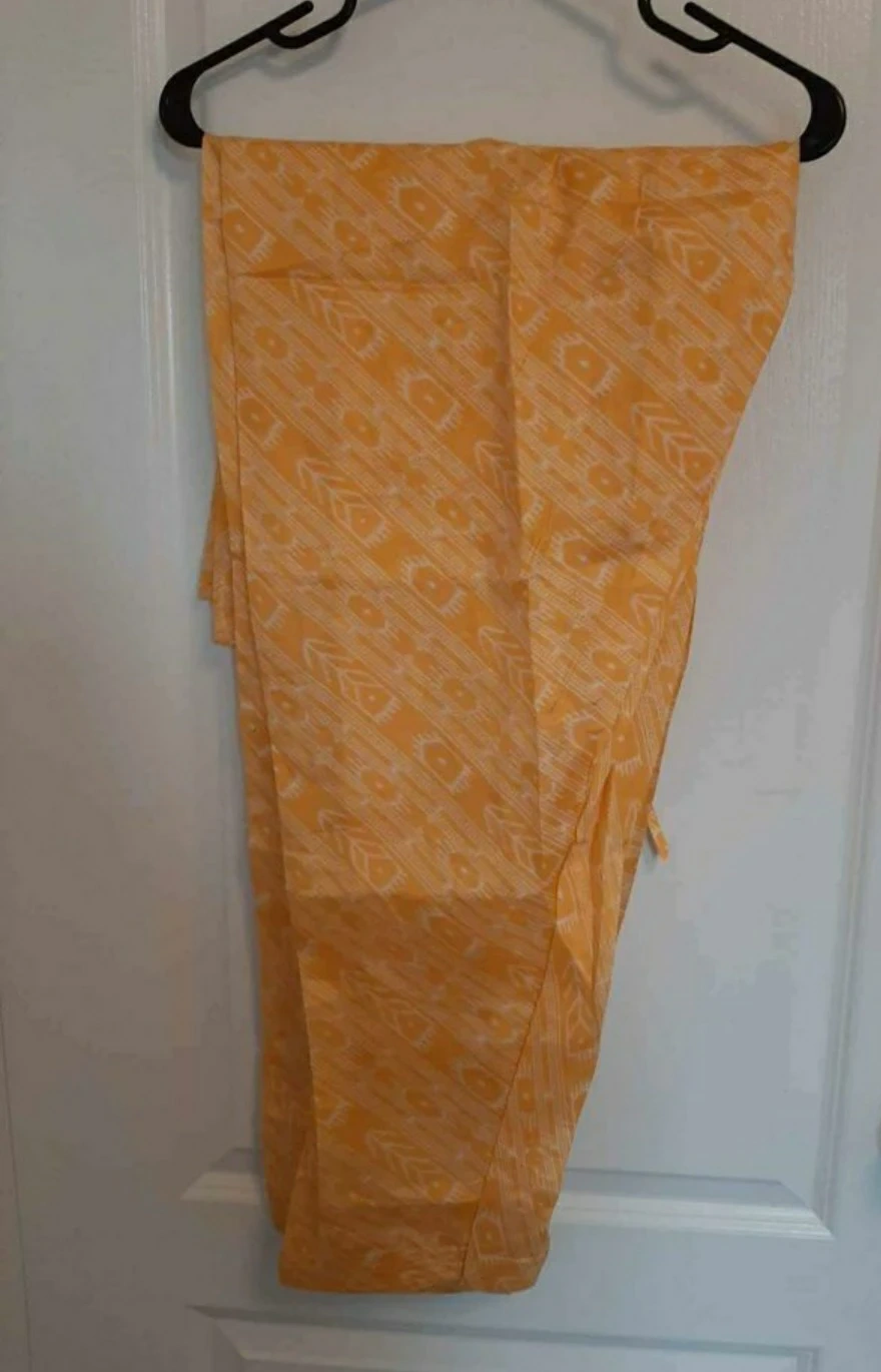 New, neatly tailored pretty yellow 3 pc salwar set from India. Full sleeve. Material is like silk-cotton. Salwar is traditional pleated salwar, large generous dupatta.