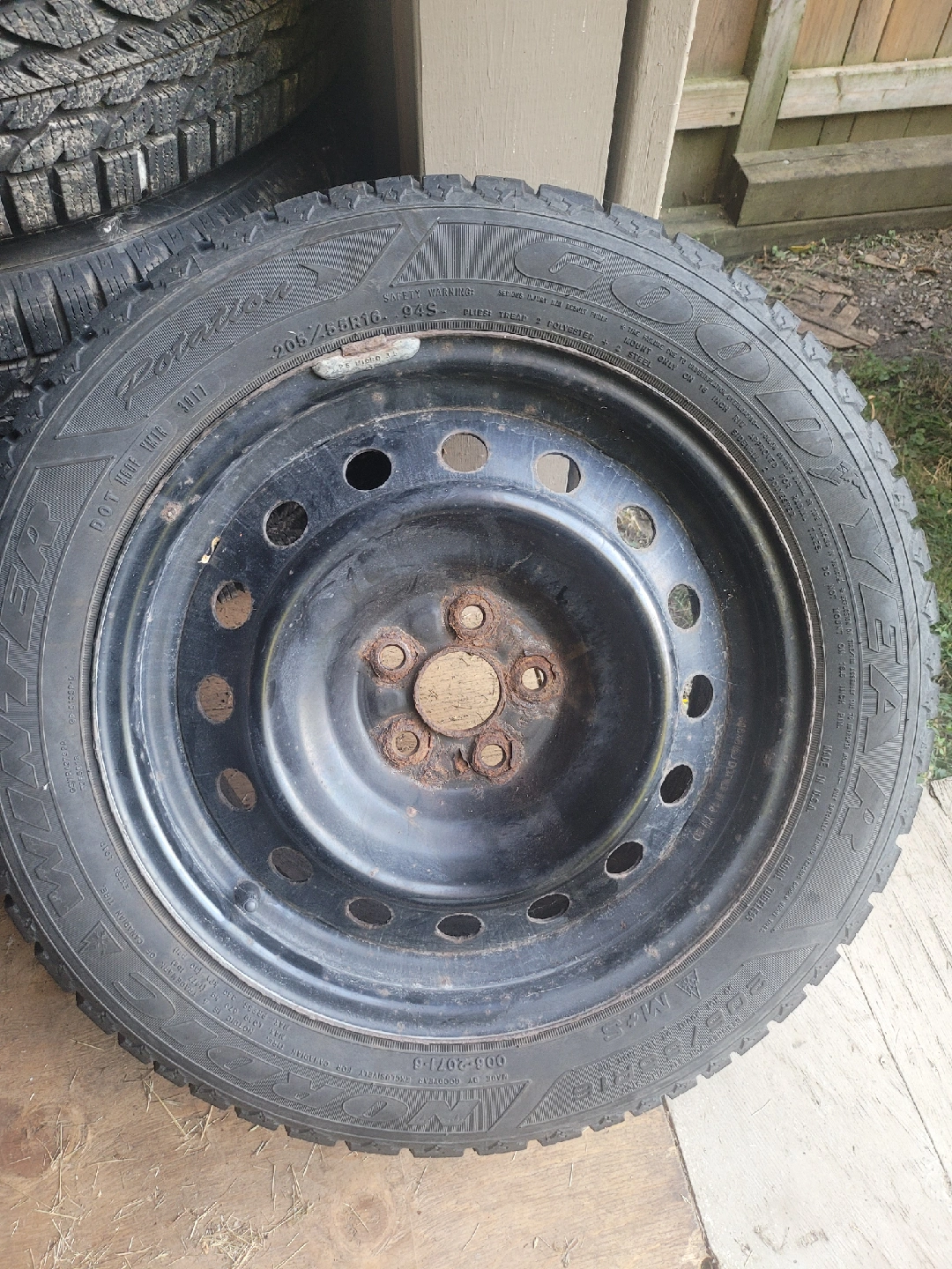 10Selling a set of GoodYear winter tires mounted on rims, also balanced. The tire size is 205/55R16. They are marked with M+S for mud and snow performance. Only used for 3 winters, so they still have plenty of life in them. Came off a 2007 Toyota Matrix so they will also fit the Corolla or any vehicle with the same bolt pattern which is 5x100. selling for $400.