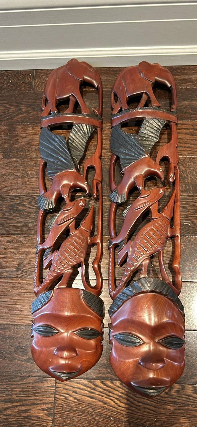 Two beautiful African hand. Carved well hangings. Elephant and bird motif. From Zimbabwe.