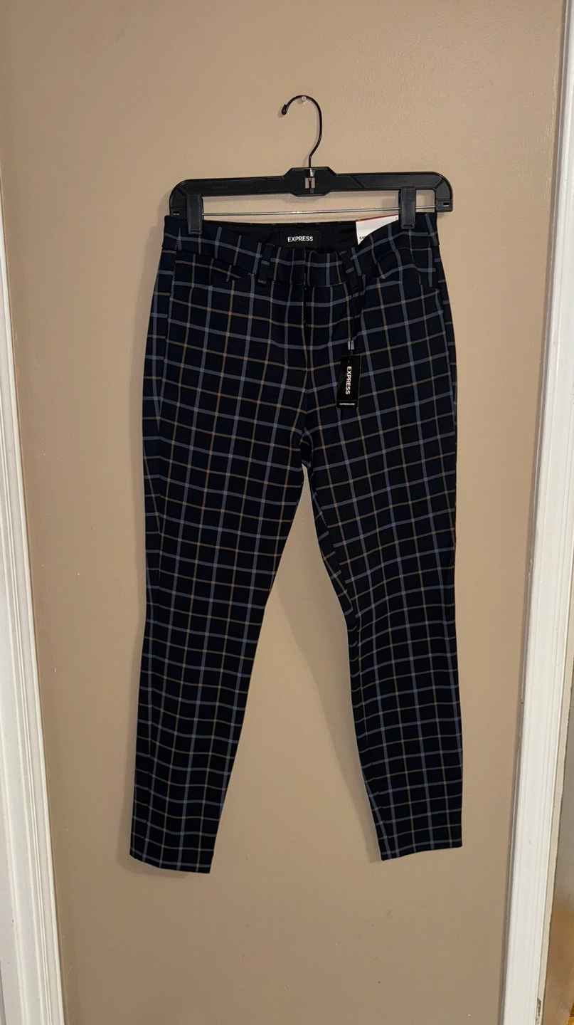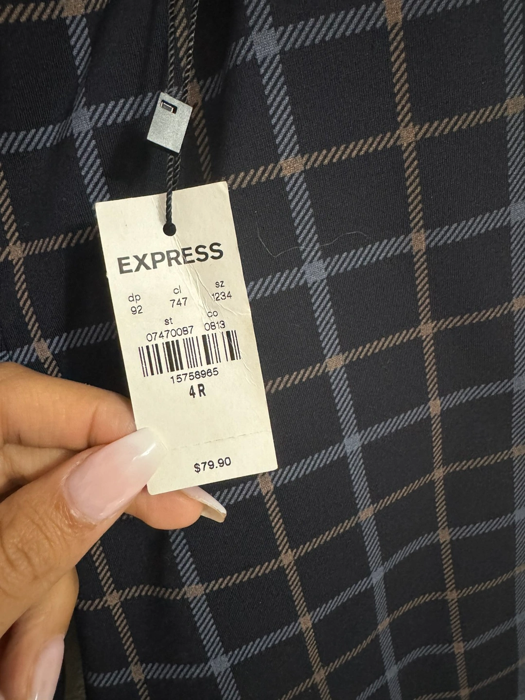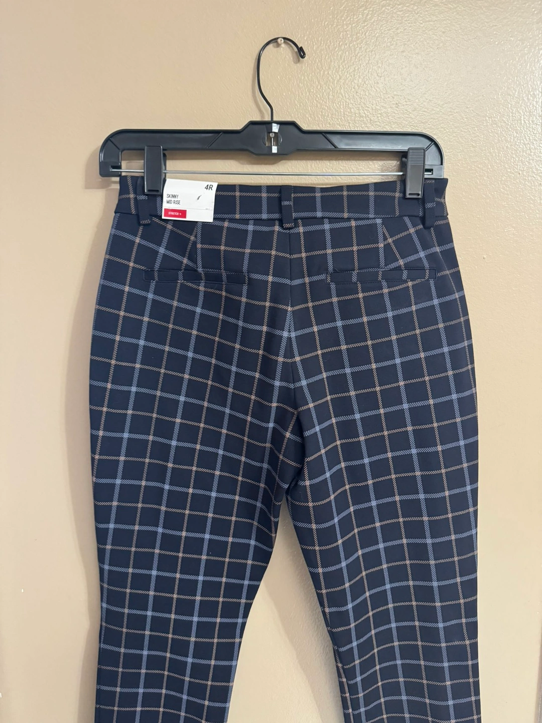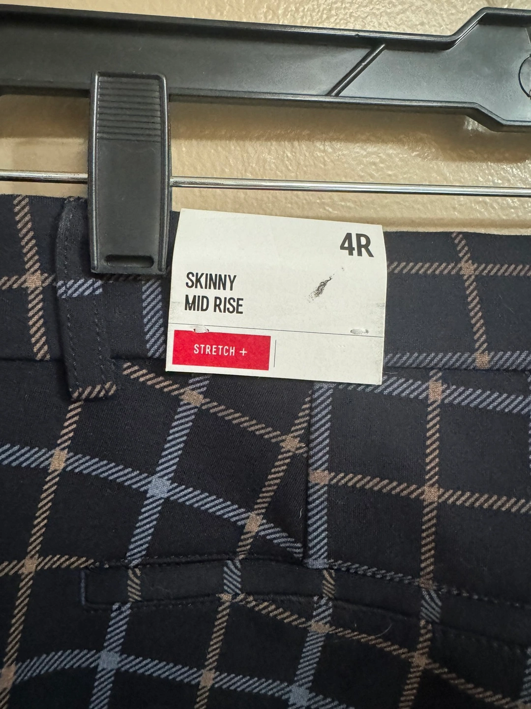 New never worn. Color is navy blue with plaid pattern. Size 4R. Stretchy.