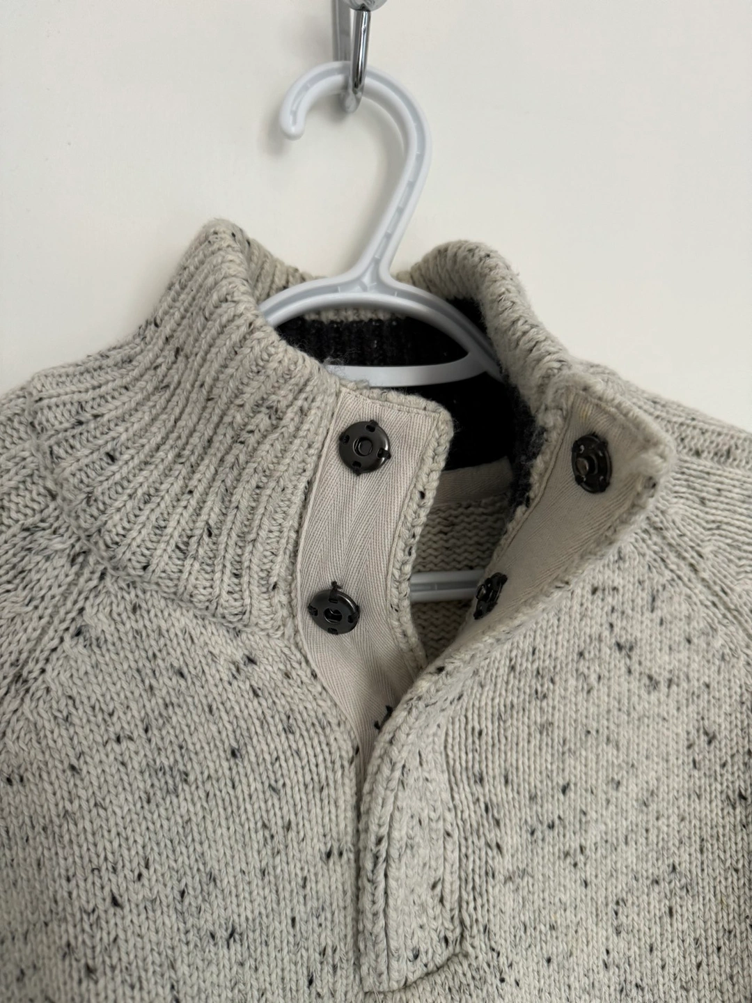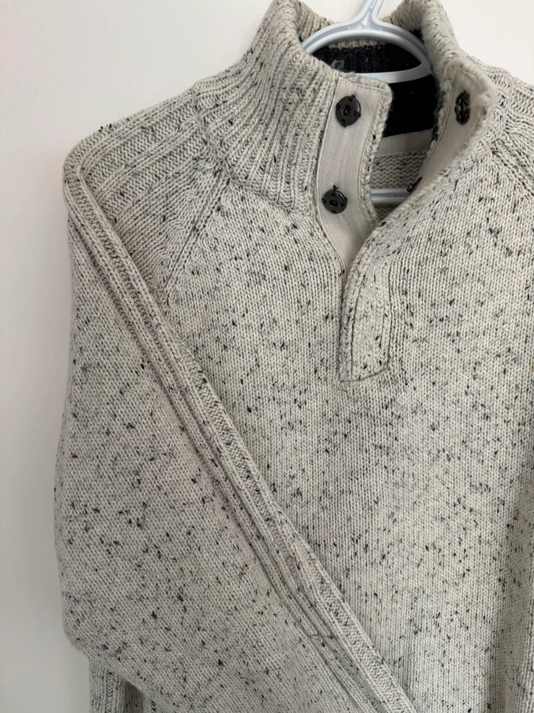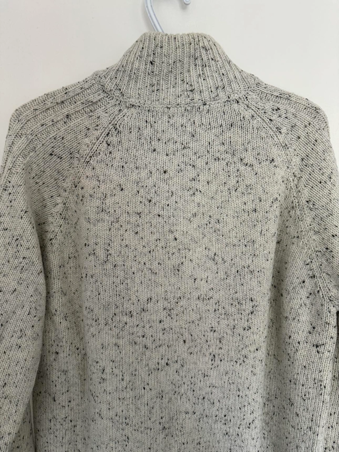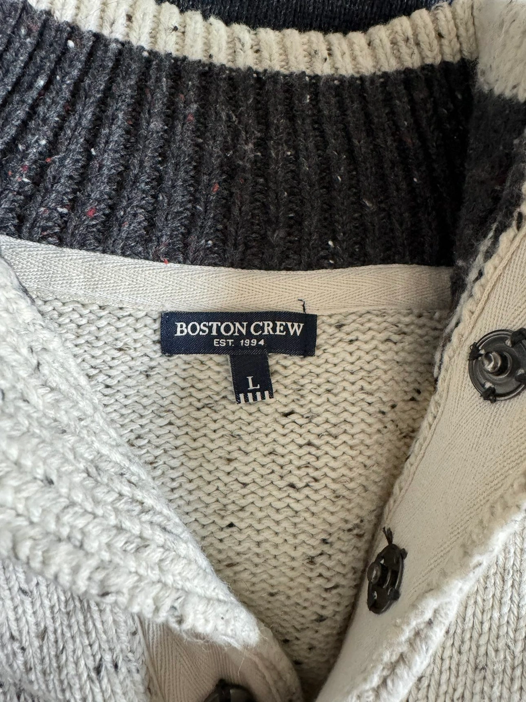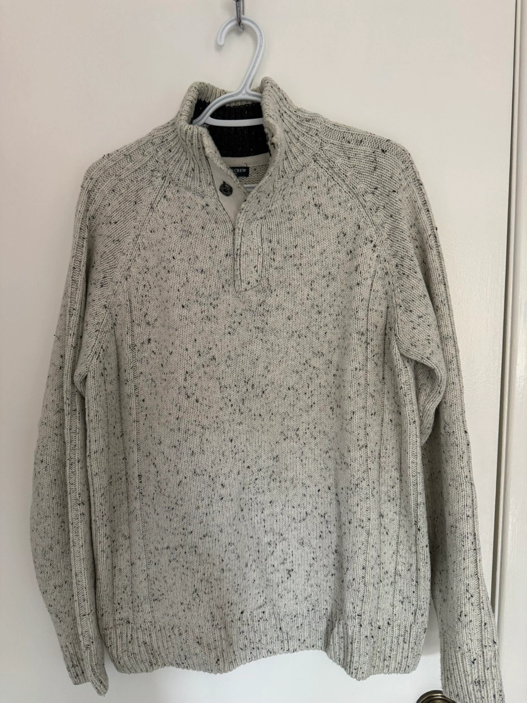 This sweater is thick and soft. It has a short collar. Size large for chest sizes 42-44”.