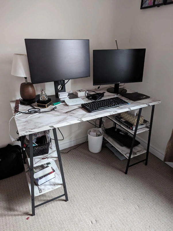 desk for school/work from home. can support multiple monitors(pictured for sizing comparison). 4 shelves for additional storage like new condition. pickup only from townhouse in Markham. Cash only.