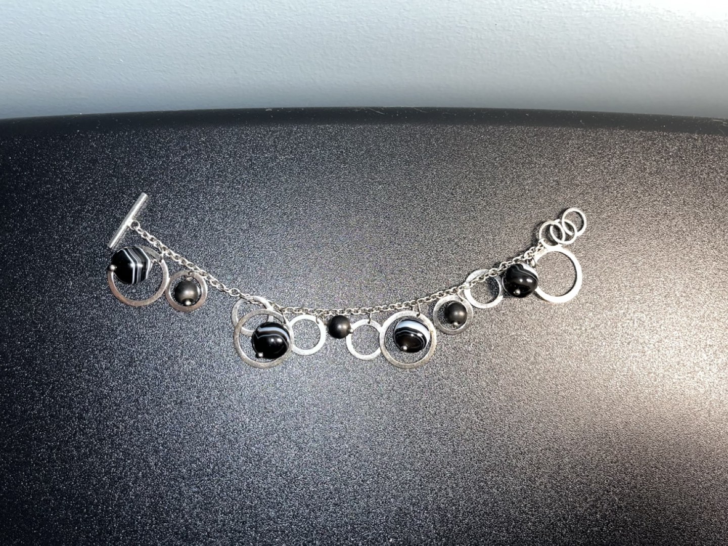 Gorgeous bracelet with dangling hoops and marbles. Has 3 clasp size options shown in last picture.