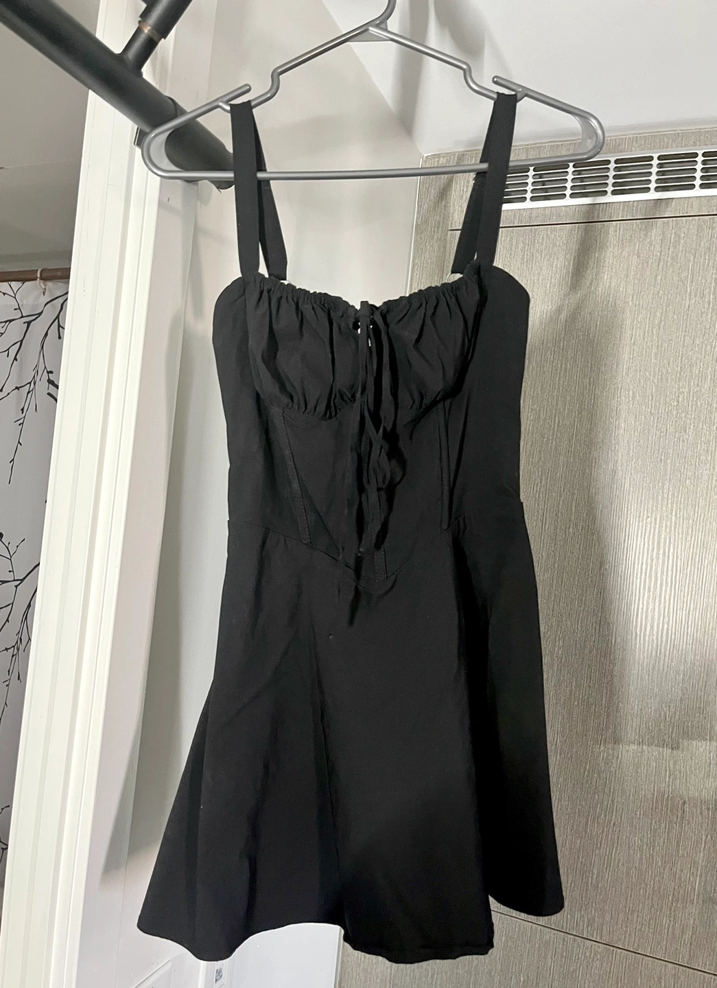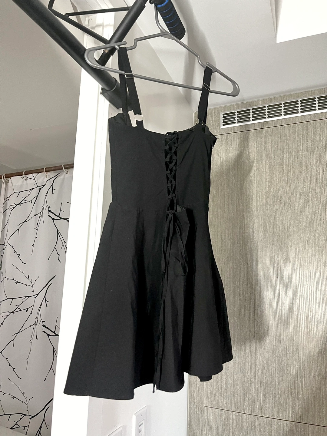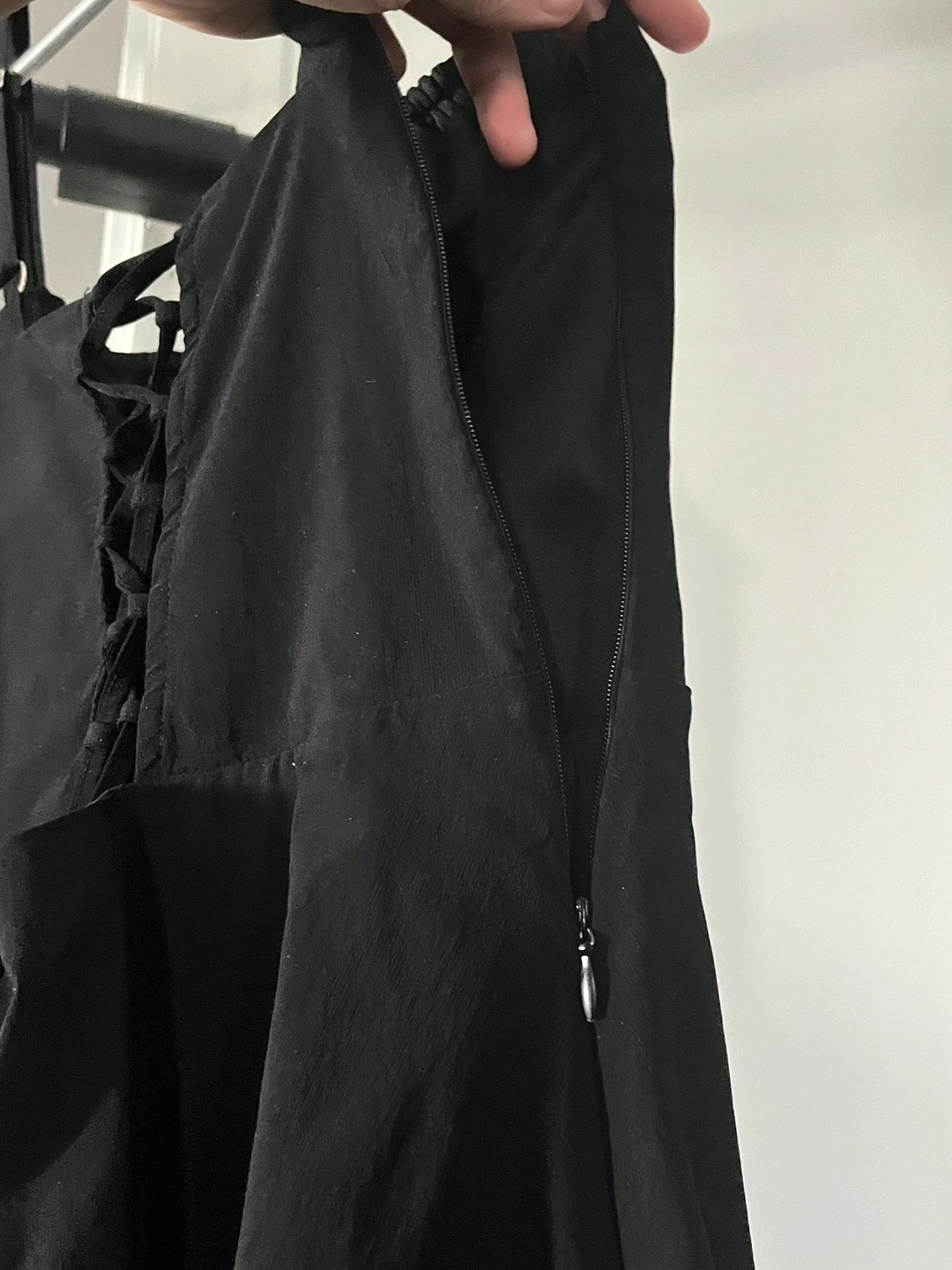 Adjustable back ties and side zipper.