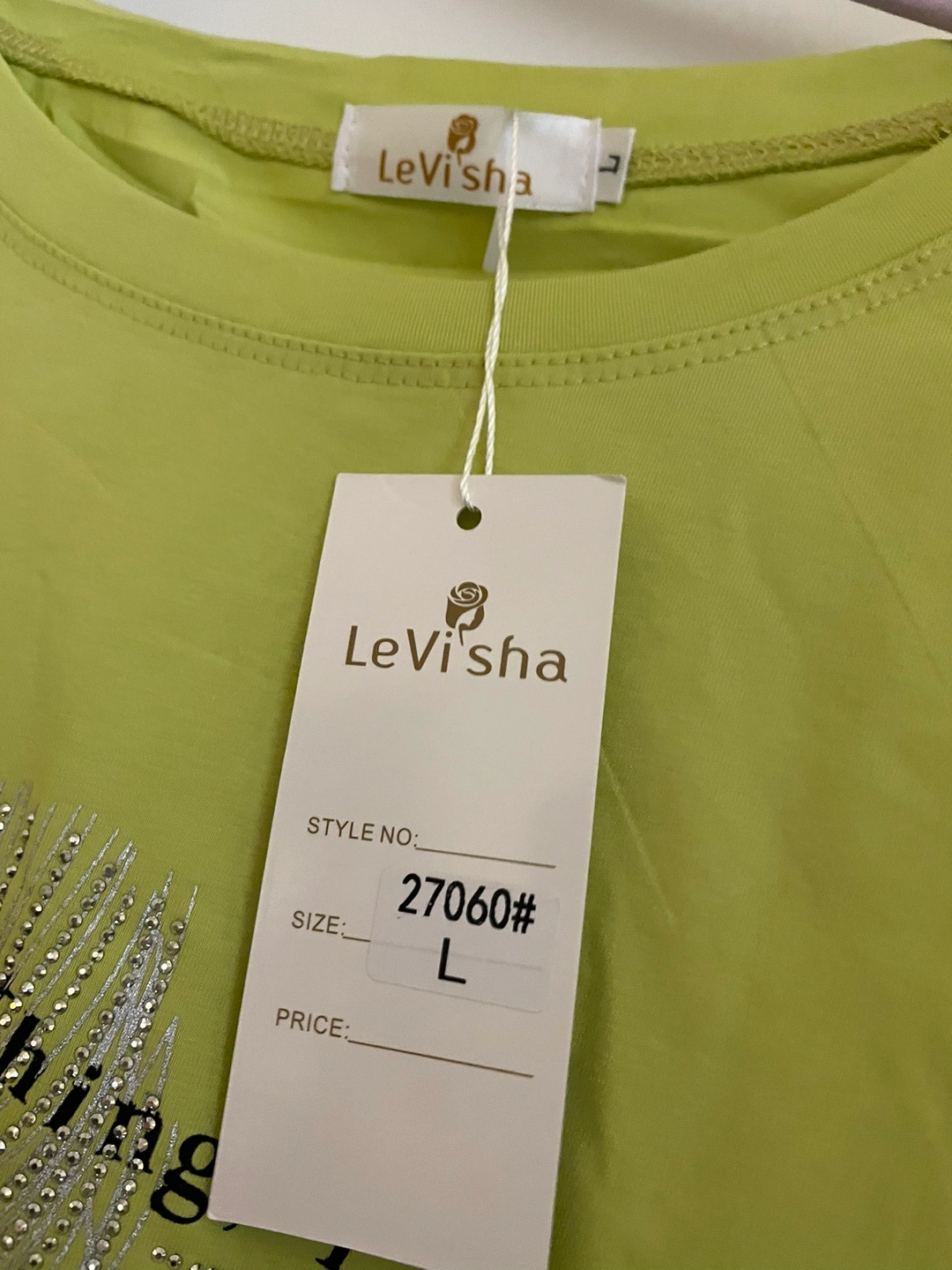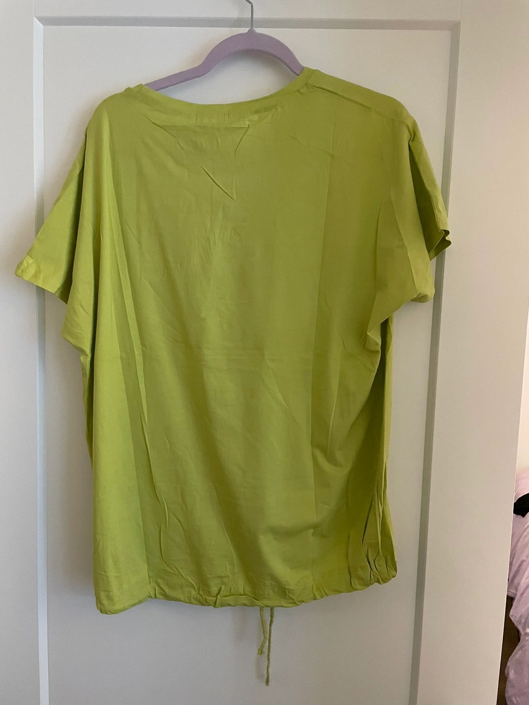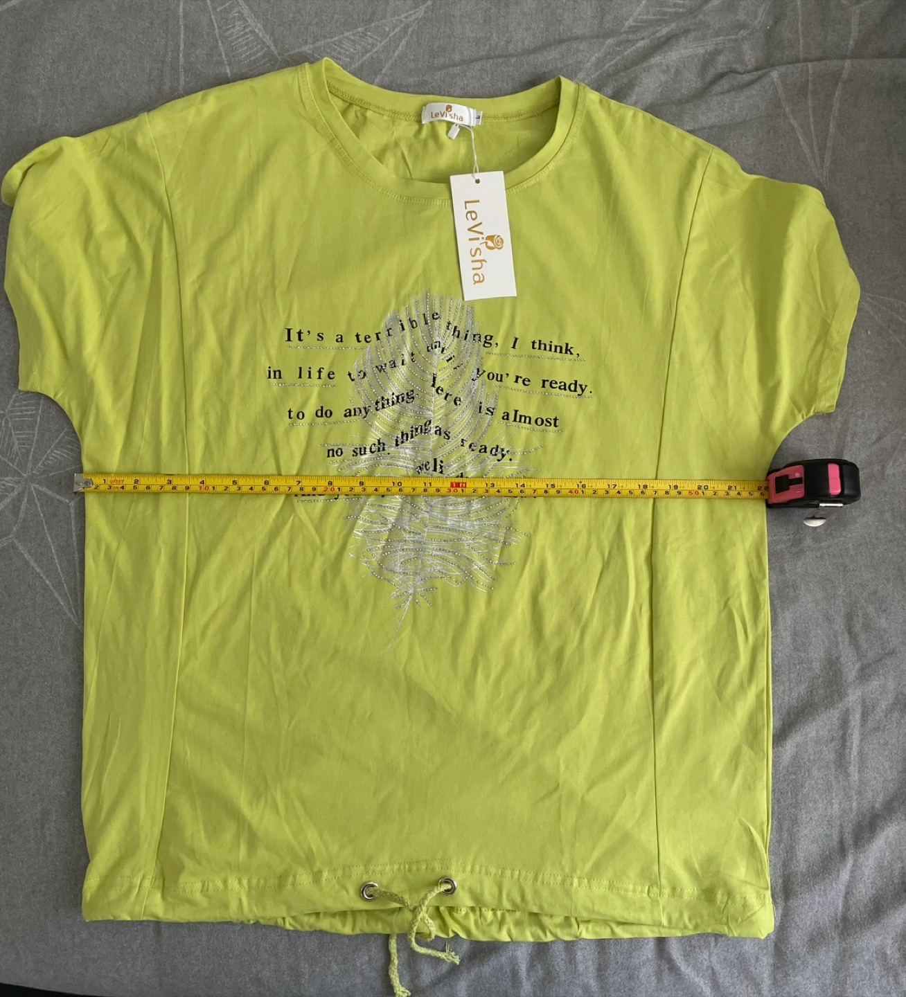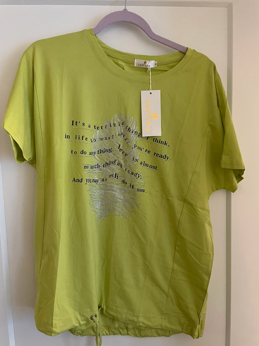 Brand new green T-shirt with text and sparking ornaments, still with original tags, size is large. Chest width: 22 inches.