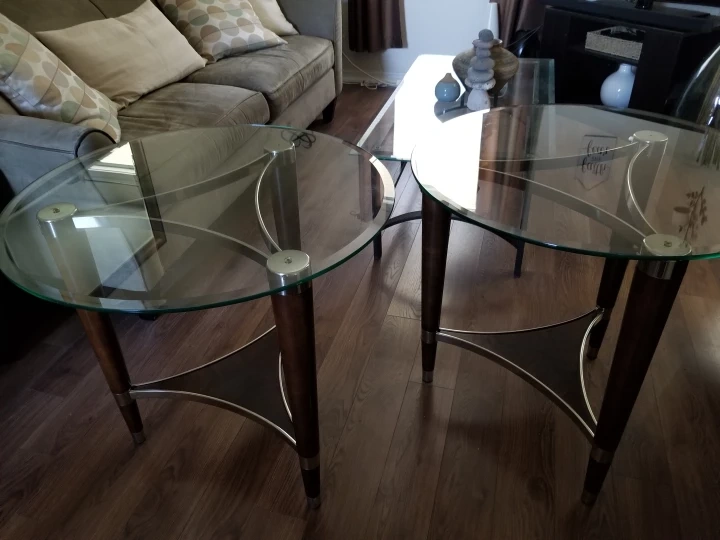 Retro beveled end tables in great condition. Beveled glass, wood, very light gold metal that almost looks silver.
