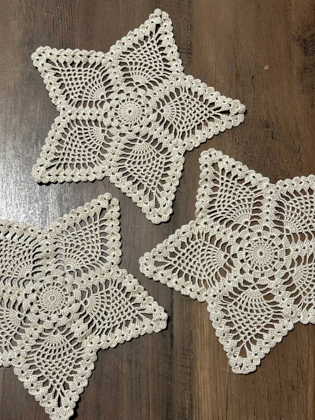 Four doilies included. Three small 5-point stars and one larger 9-point star. Small stars about 23cm (9”) in width. Bigger star 36cm (14”).