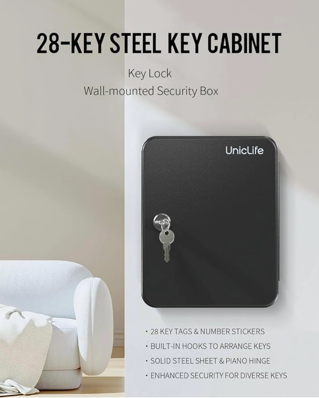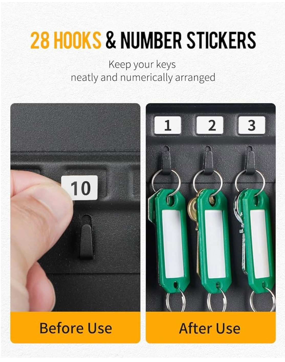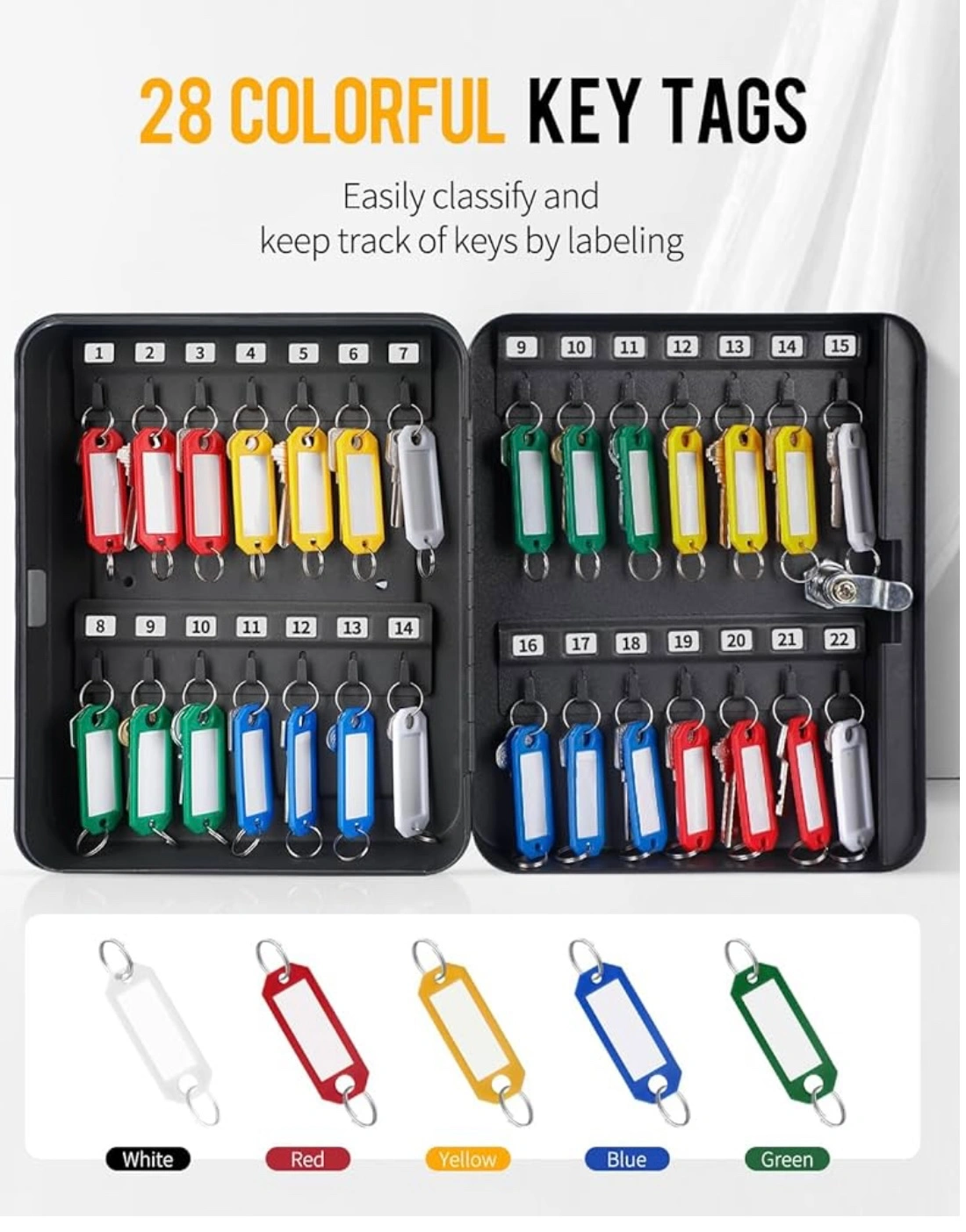 Pawfly 28-Key Steel Key Cabinet with 2 Unlocking Keys Wall Mounted Key Organizer Black Frosted Security Box with Hooks and Large Key Tag Labels Identifiers in 5 Assorted Colors