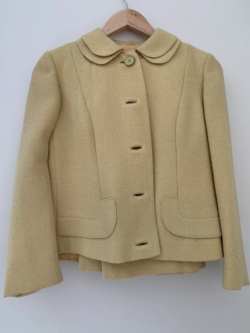 A very Jackie Kennedy style skirt and jacket set in yellow wool. I’m moving and she needs a new home — for free!