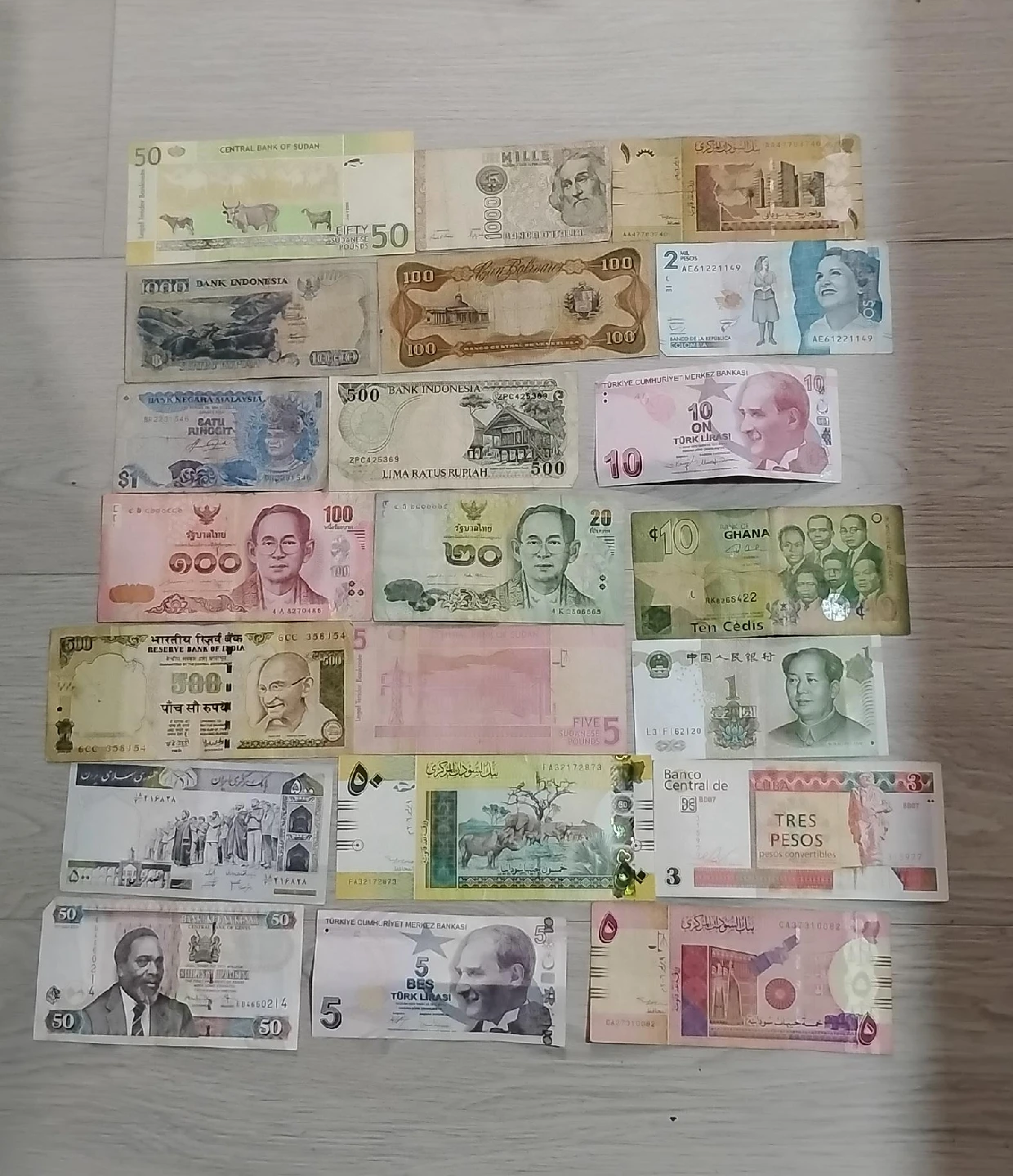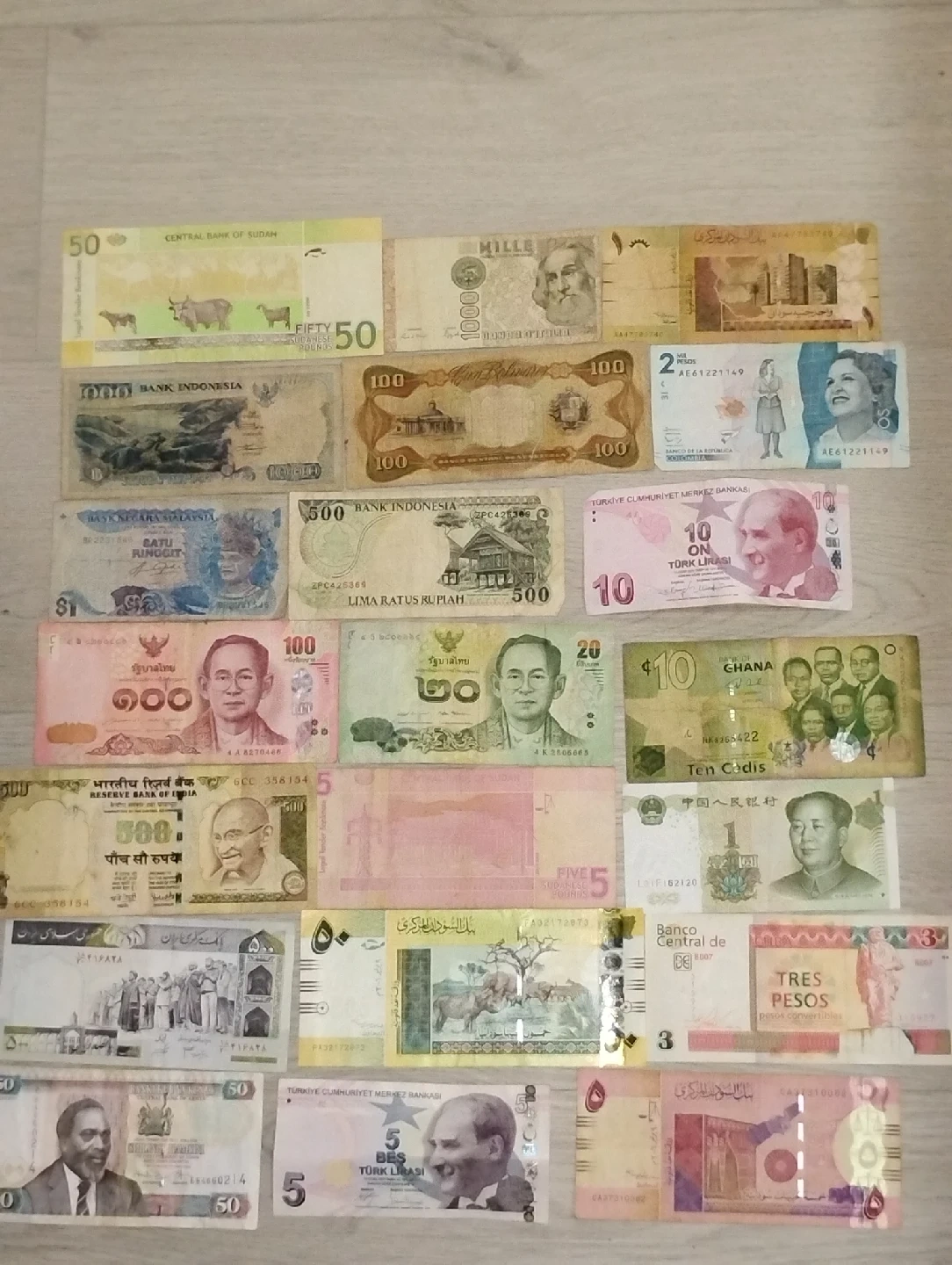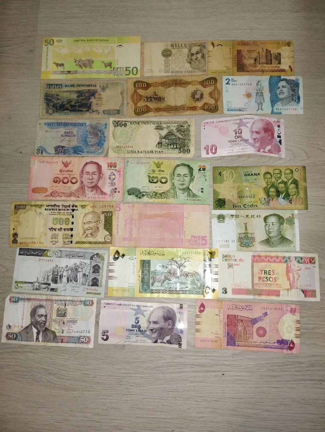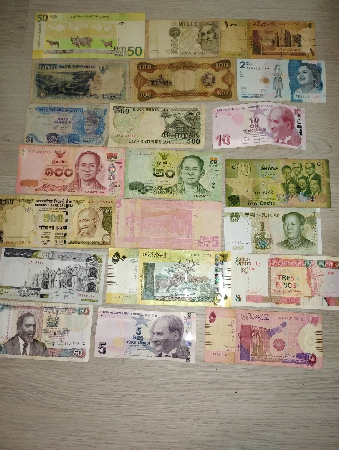 301A collection of international currency notes from various countries, including Indonesia, Sudan, Ghana, and Turkey. Each bill has unique designs and historical significance. Perfect for collectors or anyone interested in world currencies