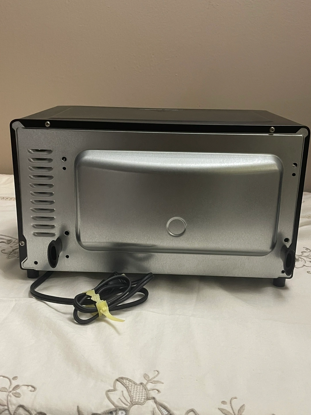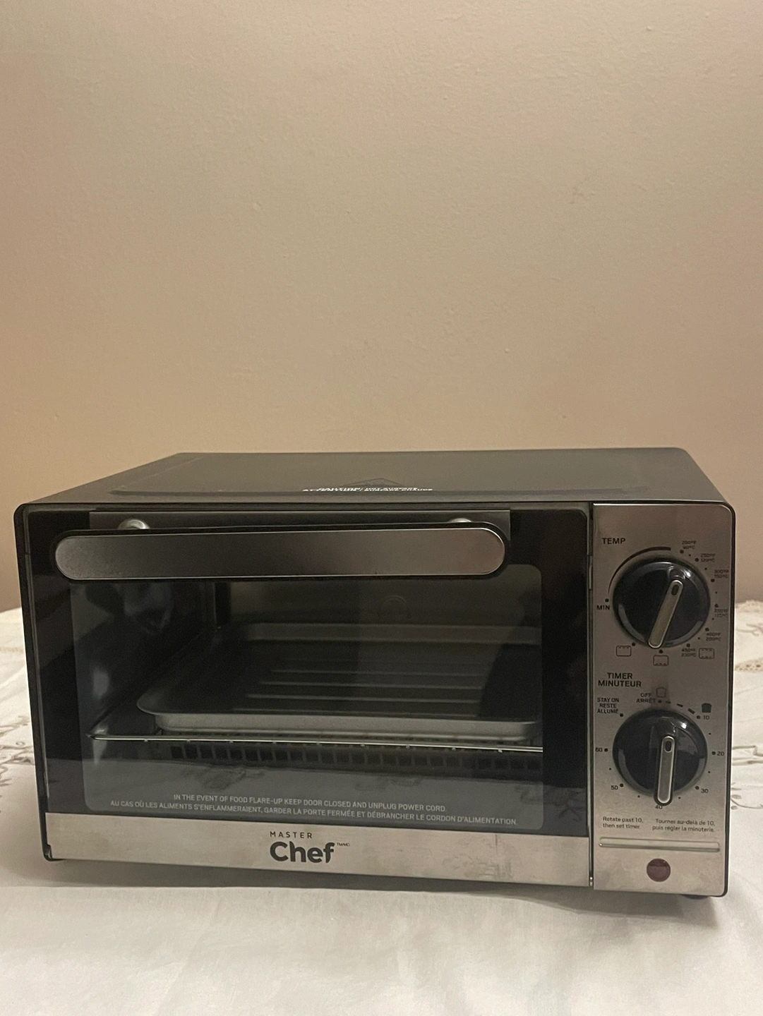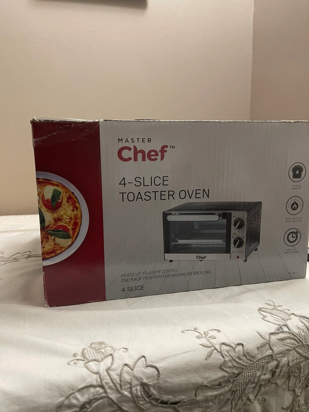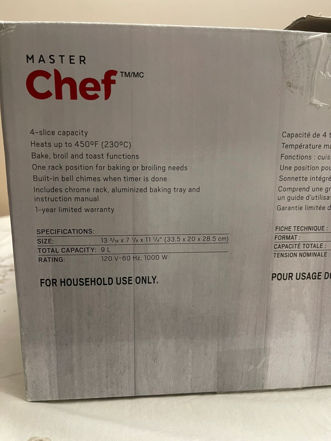 brand new MASTER chef- medium sized oven. W/3 functions, stainless steel 4 slices. Measurements: H 7.95 inches, L 12.76 inches, D 14 5/8 inches 2.59 kg