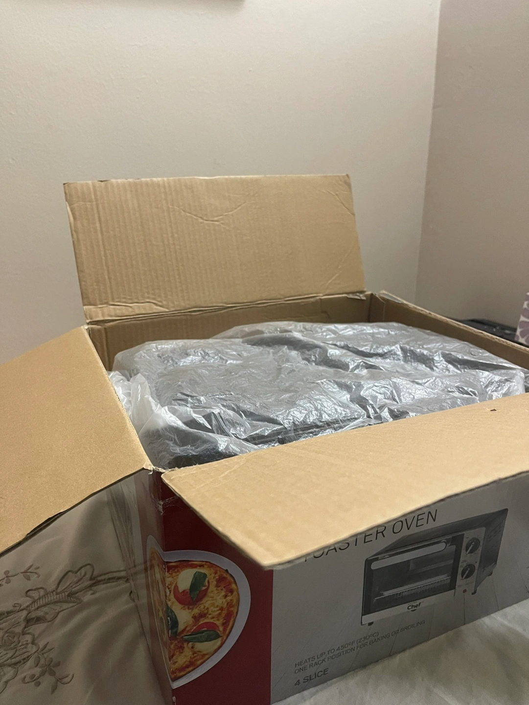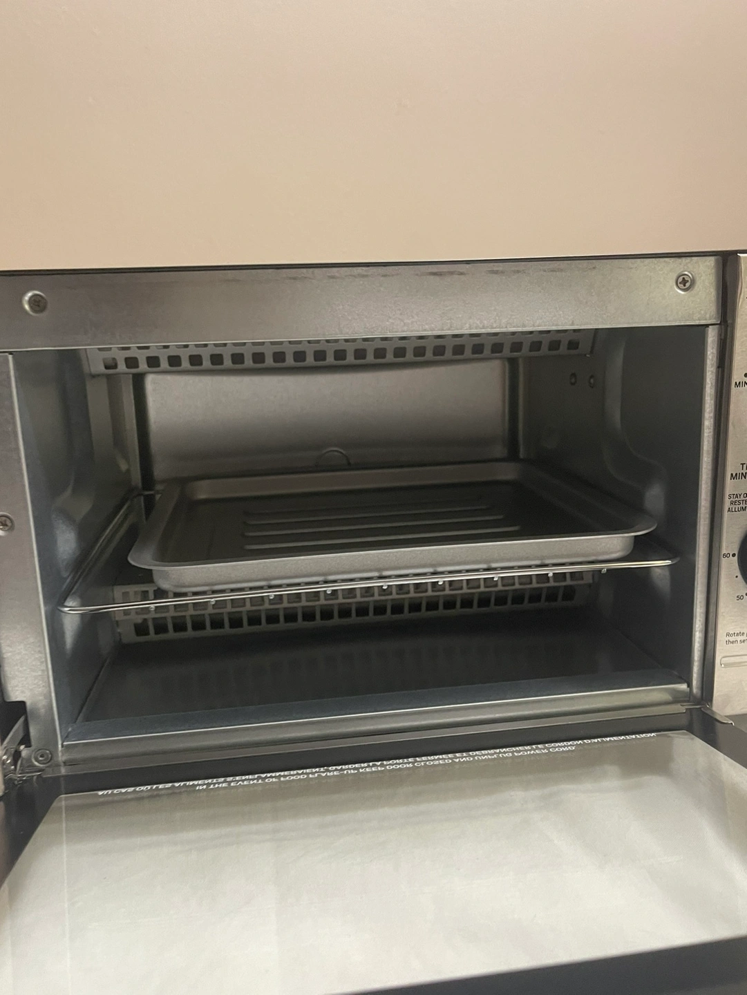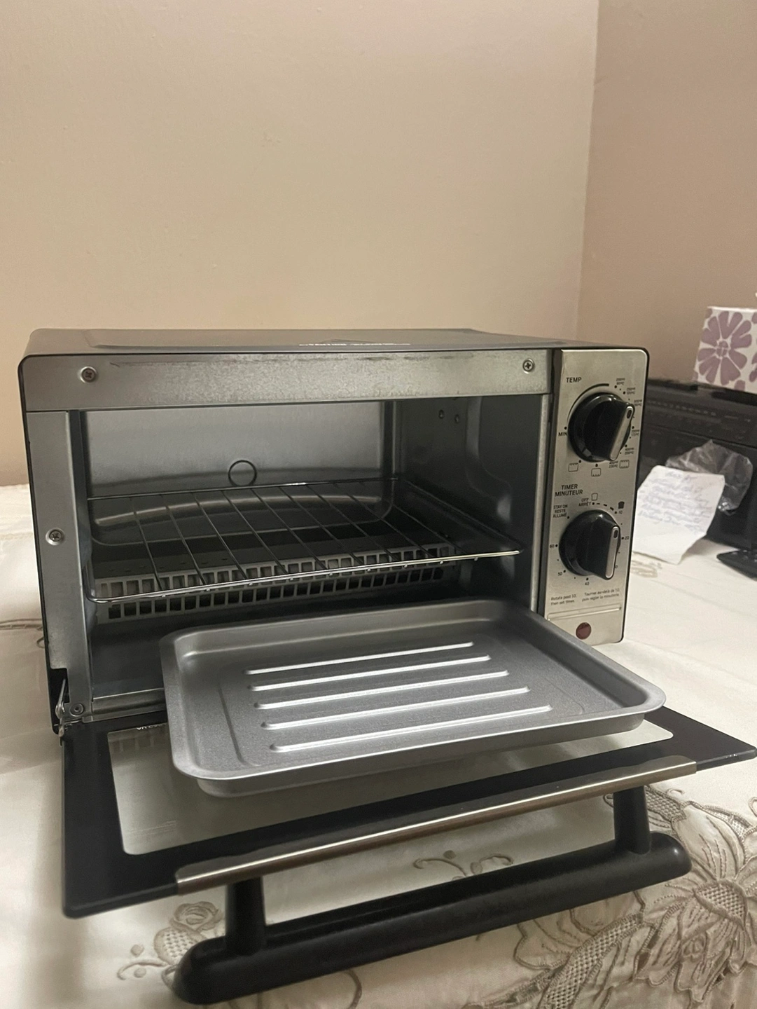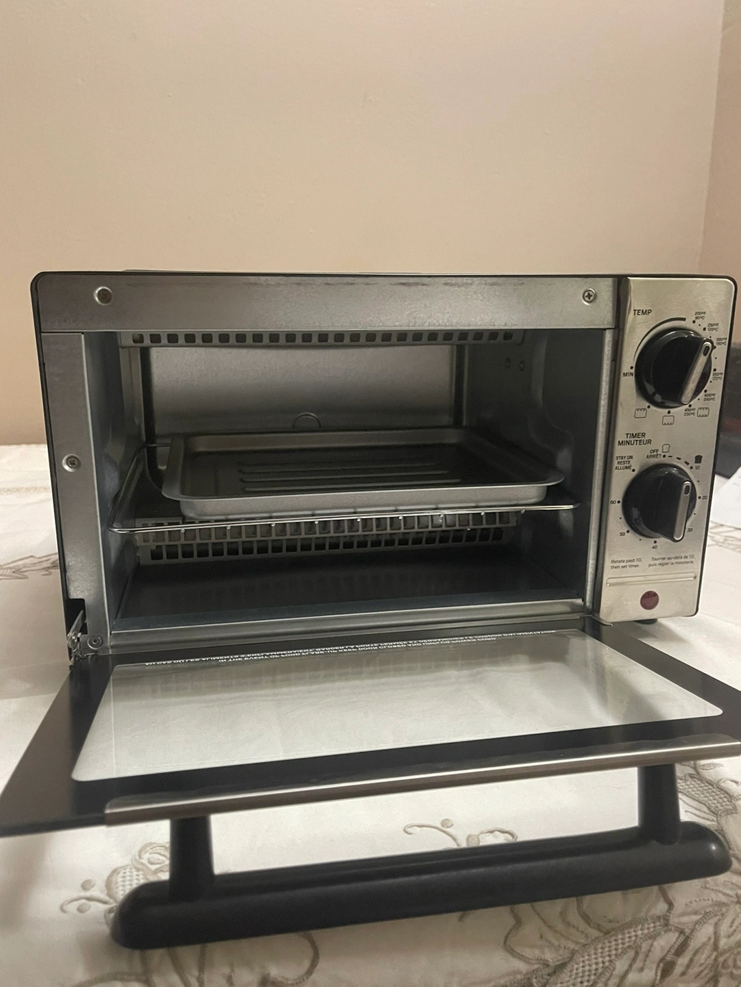 brand new MASTER chef- medium sized oven. W/3 functions, stainless steel 4 slices. Measurements: H 7.95 inches, L 12.76 inches, D 14 5/8 inches 2.59 kg