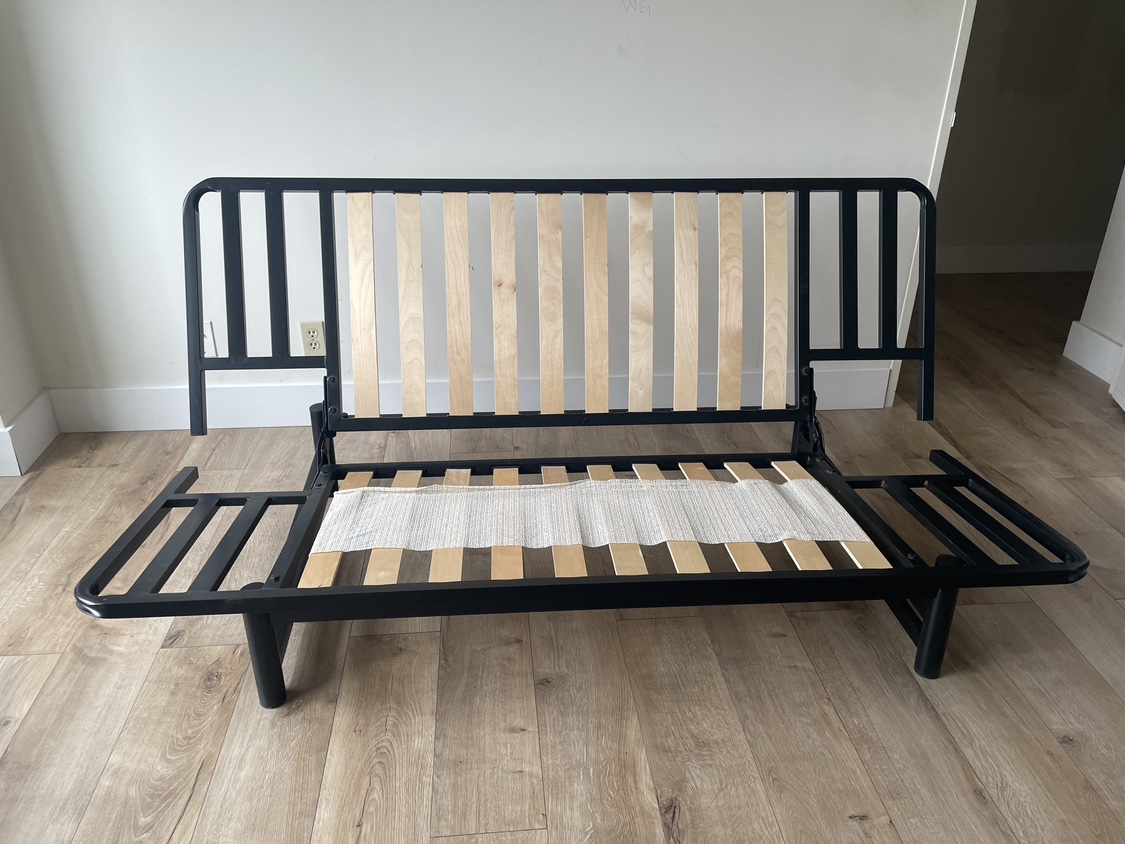 Double sized frame for mattress, can be folded up to be a sofa with a futon mattress.