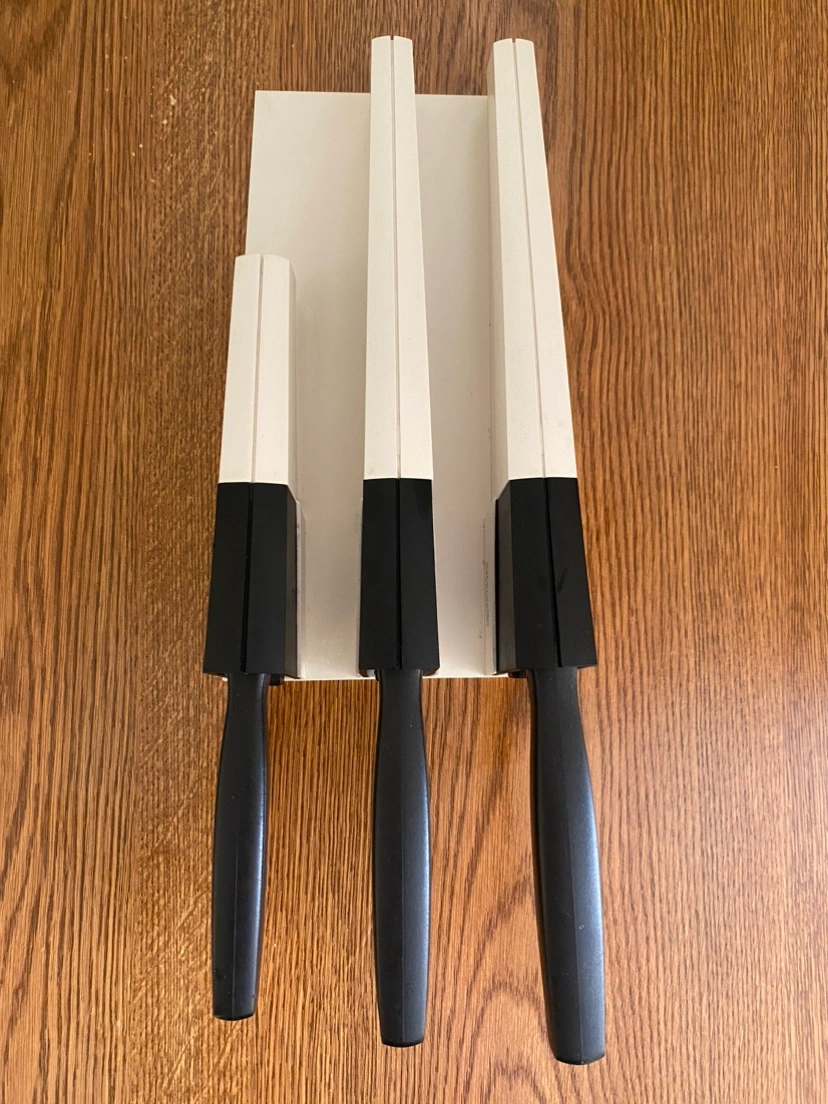 Set of three knives with sharpening holder.