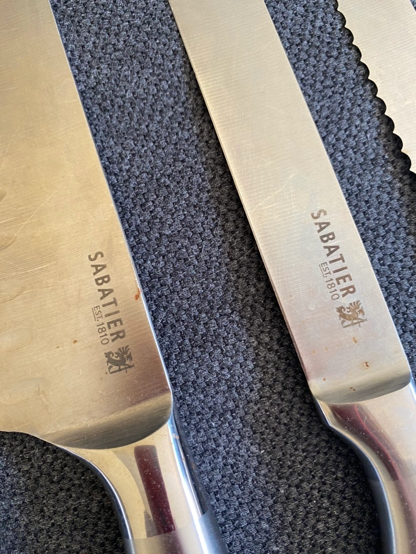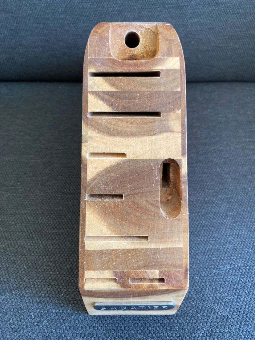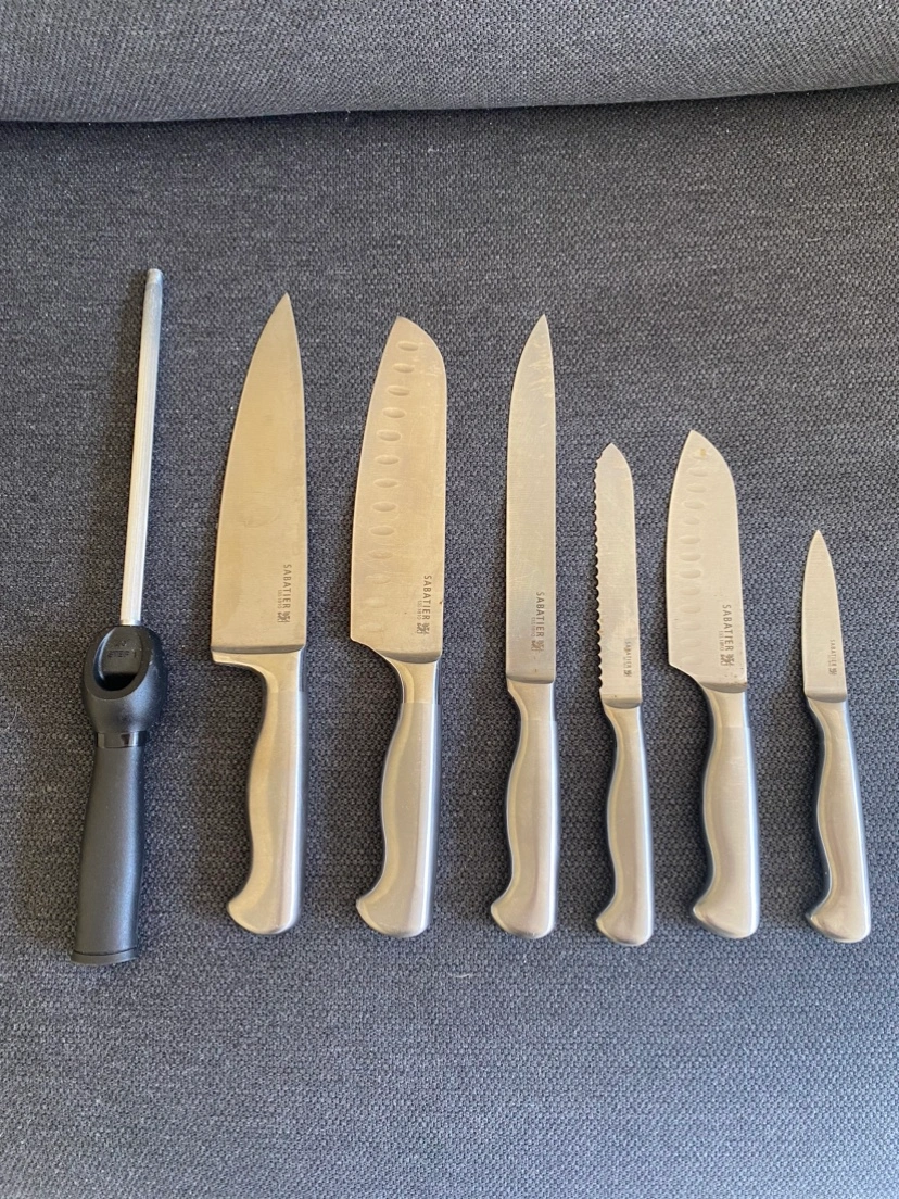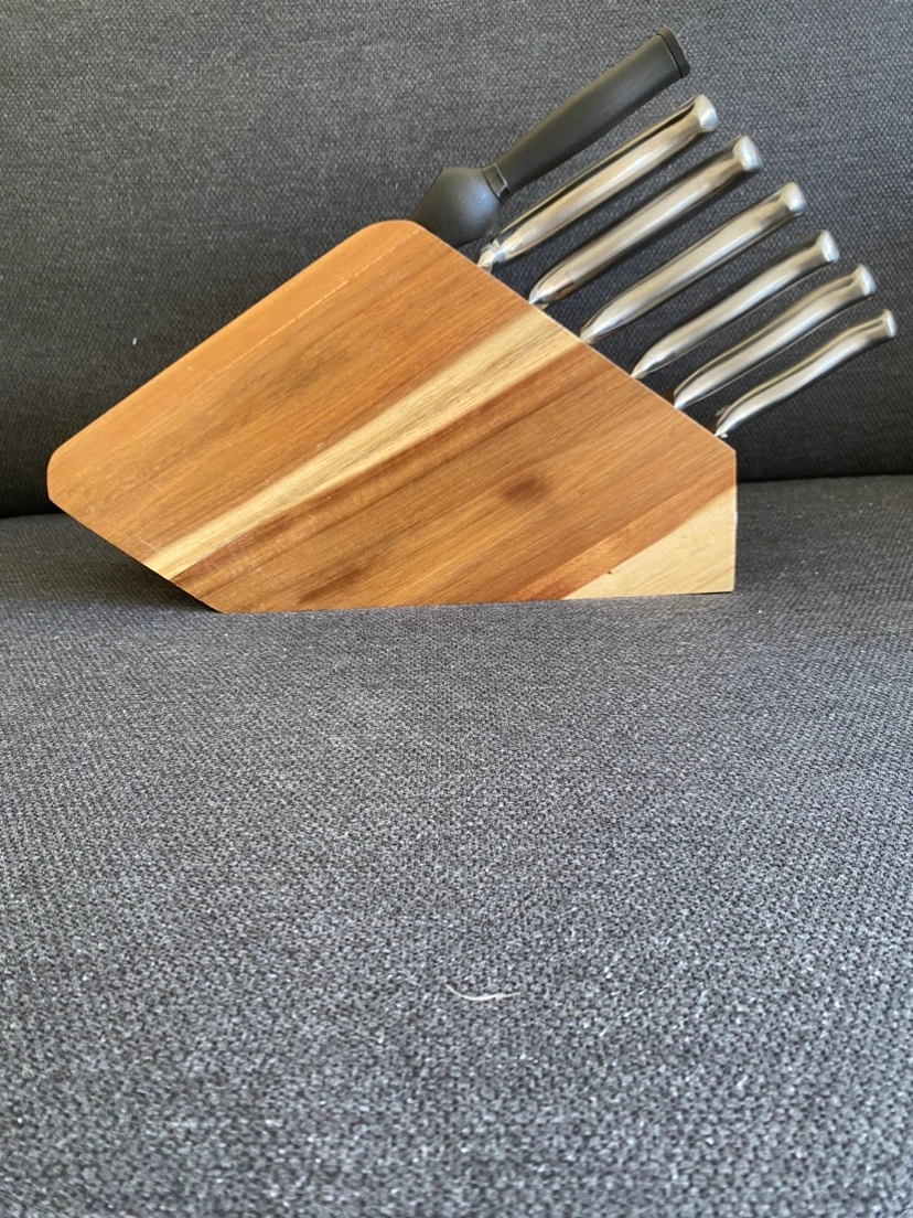 Wood knife block comes with six stainless steel knives and sharpening rod. Missing kitchen scissors.