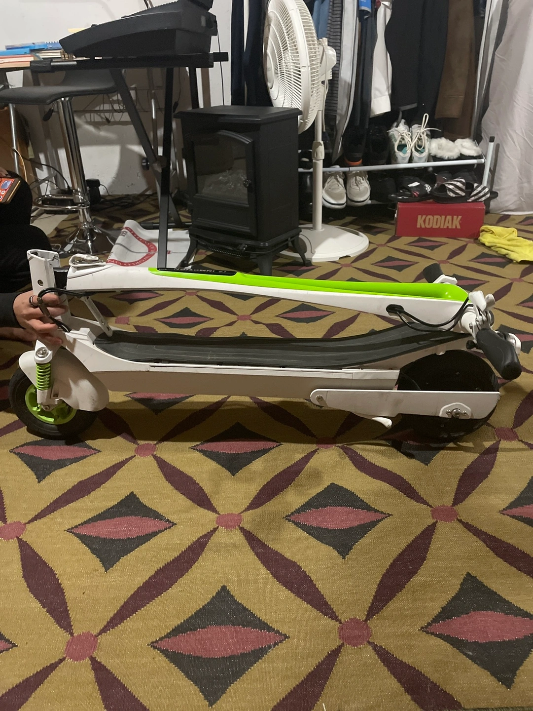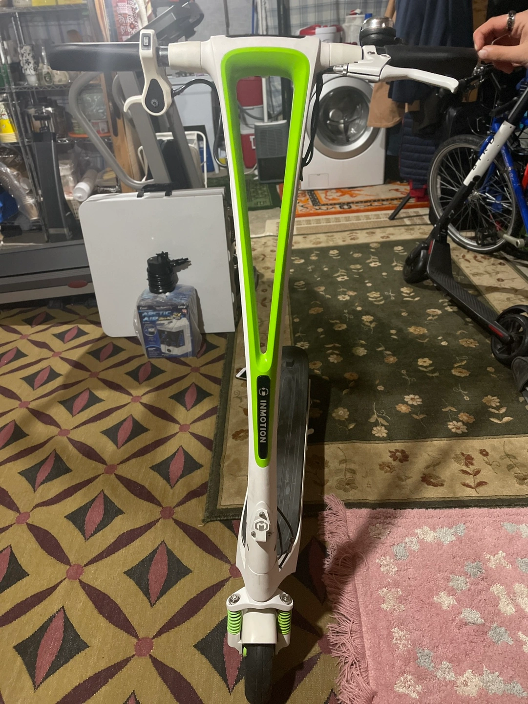 An electric INMOTION scooter in a very good condition selling cheap because a lock needs a little repair. It’s a foldable scooter with shock absorbers and comes with original charger. The scooter itself is fine but the hinge that keeps the scooter’s handle up is broken. The safety features on the scooter don’t let it run until the hinge is locked so it needs a zip tie to keep it up. Selling very cheap. Original price $900 plus.