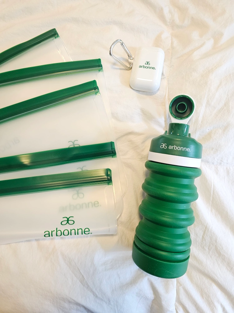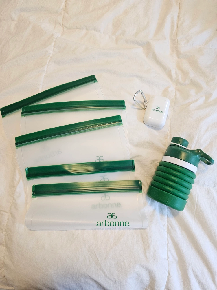 Sustainable travel set comes with 5 reusable zip lock bags, reusable straw, and retractable water bottle!