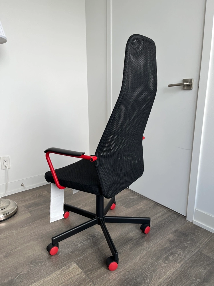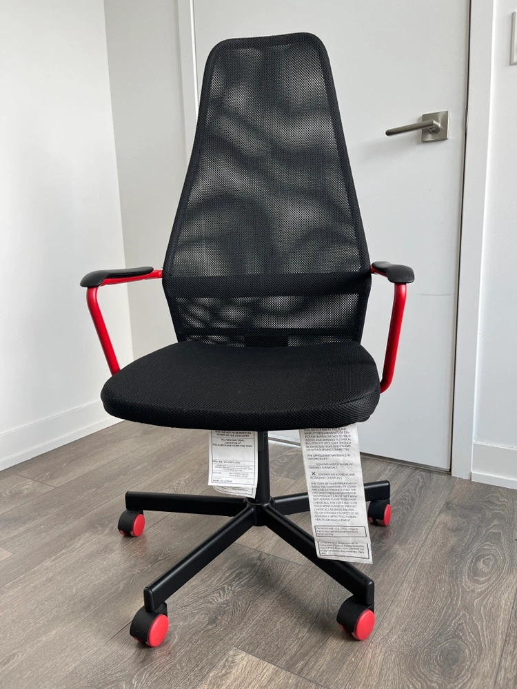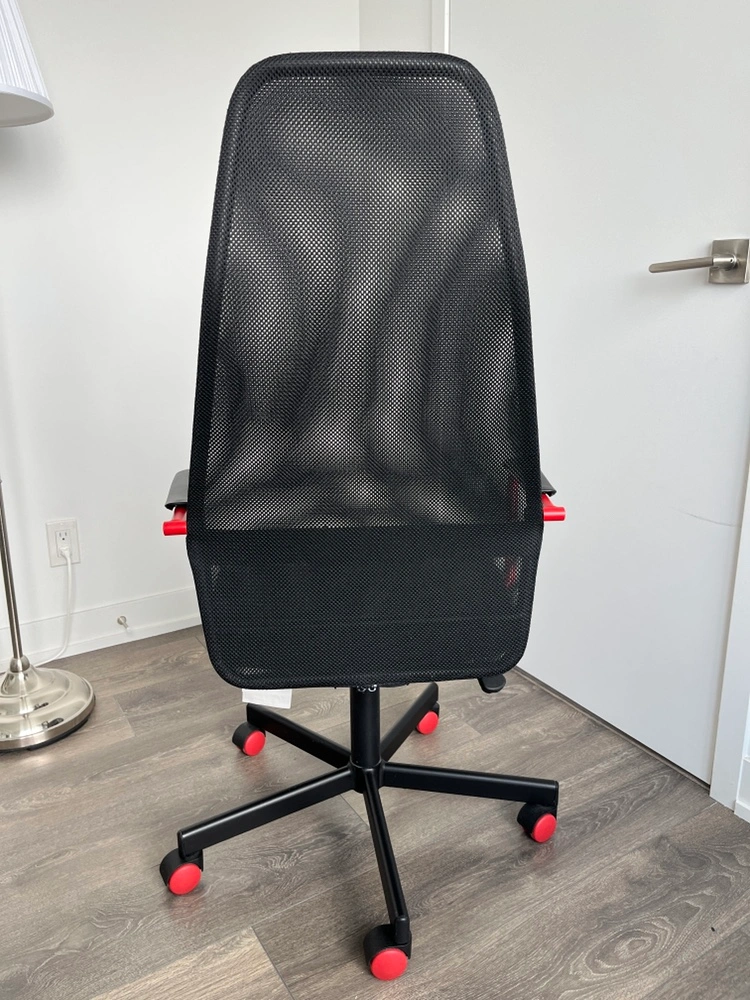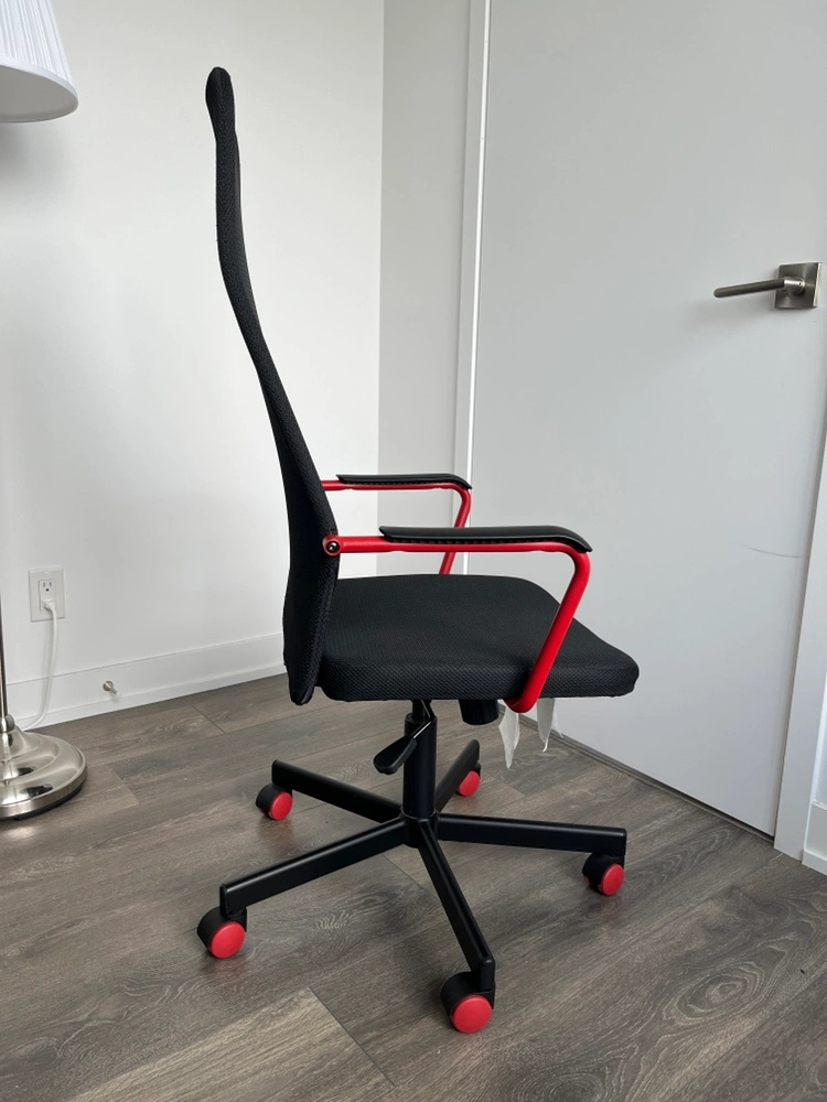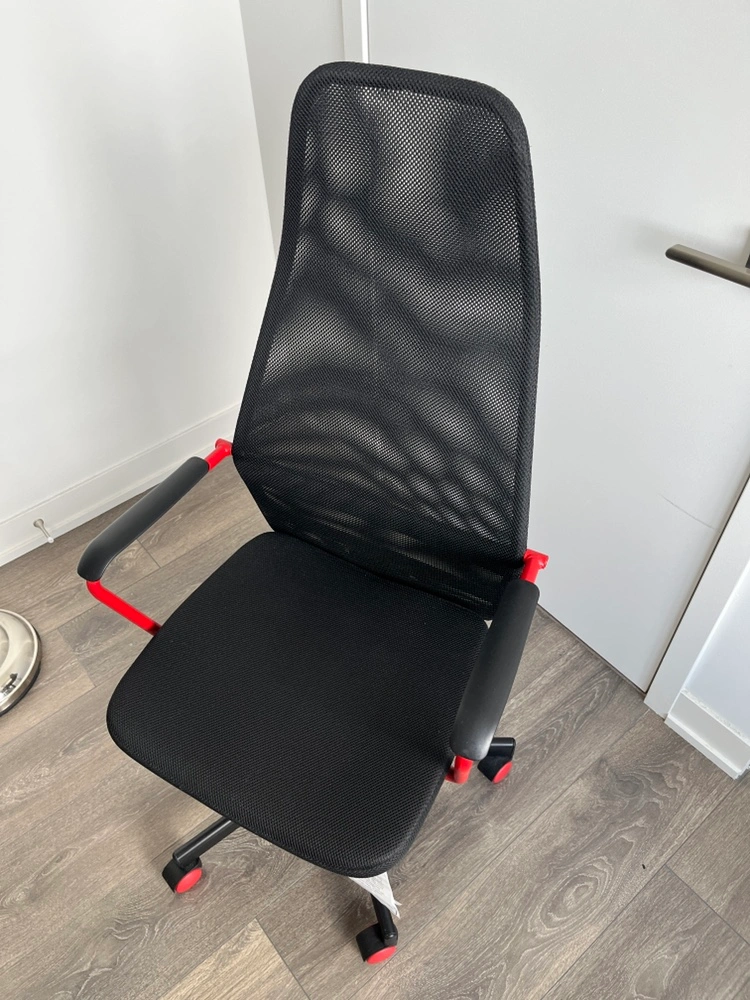 Office / Gaming chair in a cool and chic look (Black and red). Height and angle adjustable. Bought it a year ago and constantly clean and maintain it, so it is in a perfect condition like it was newly bought. Current price on Ikea is $99.
