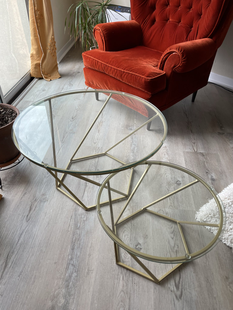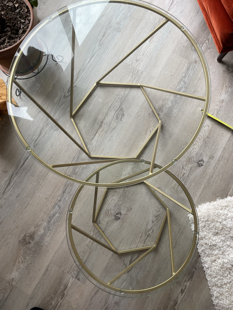 Two glass tables with gold trim. Pick up only in the beaches, fastest pick up preferred.