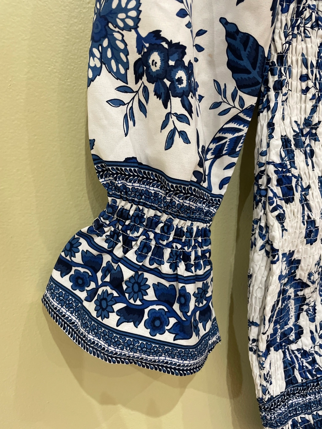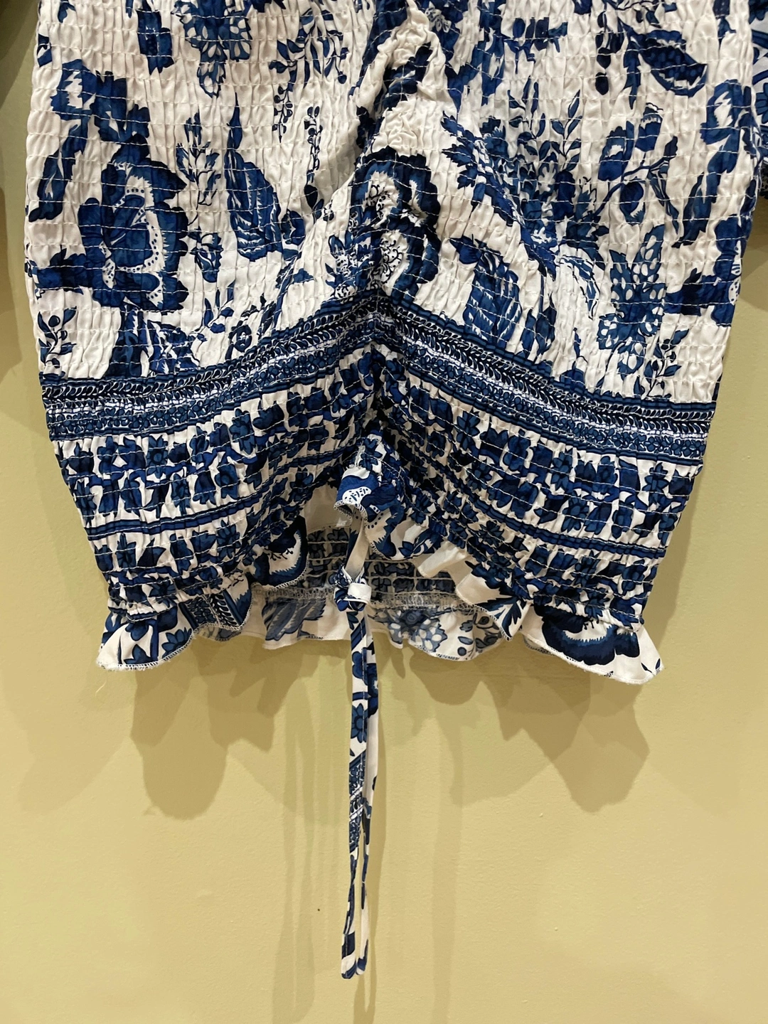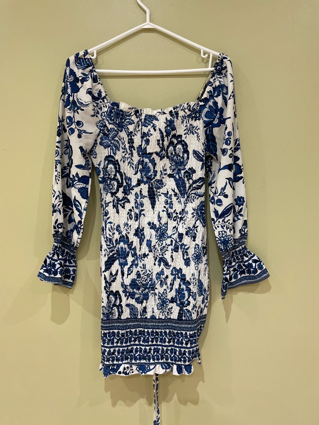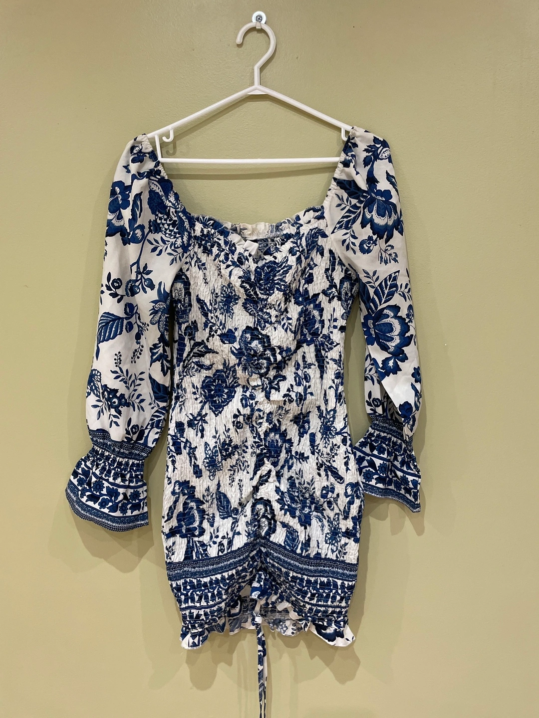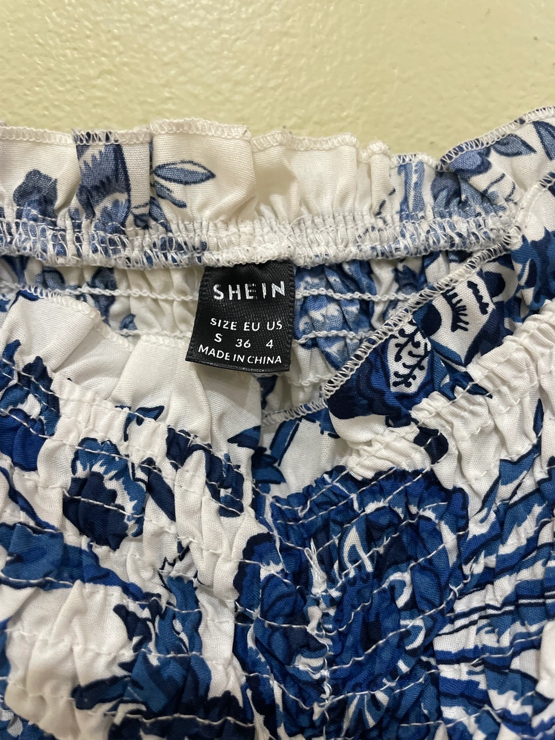 Pre-loved SHEIN body-con women’s blue and white dress. Made in China.
