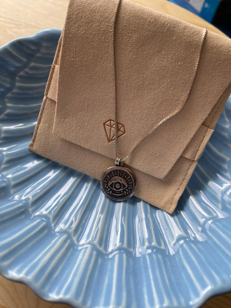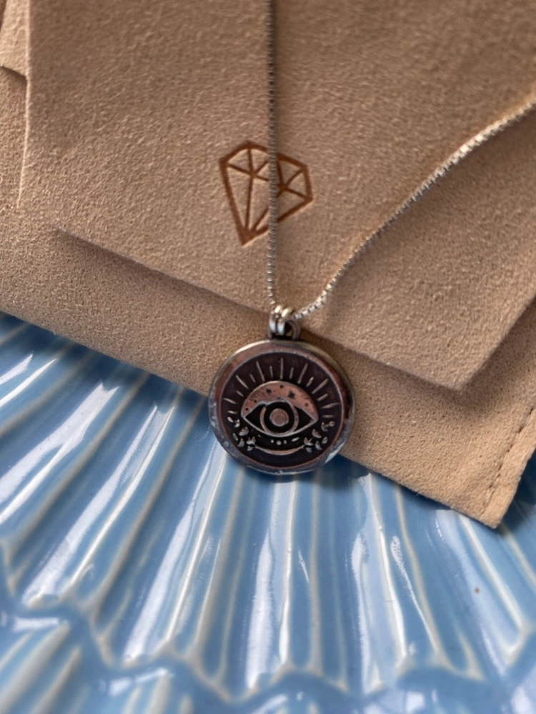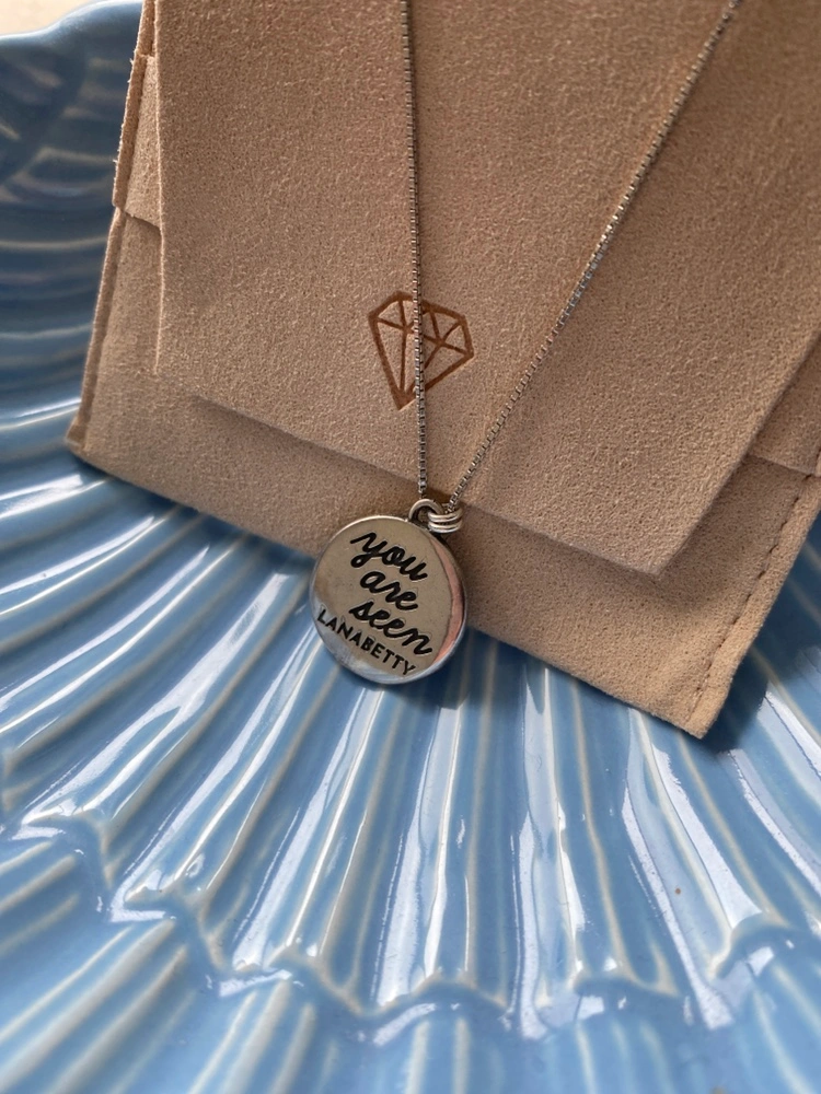 This cute necklace has a message on both sides. The front is has an eye etched on it. The other say, “You are seen.”