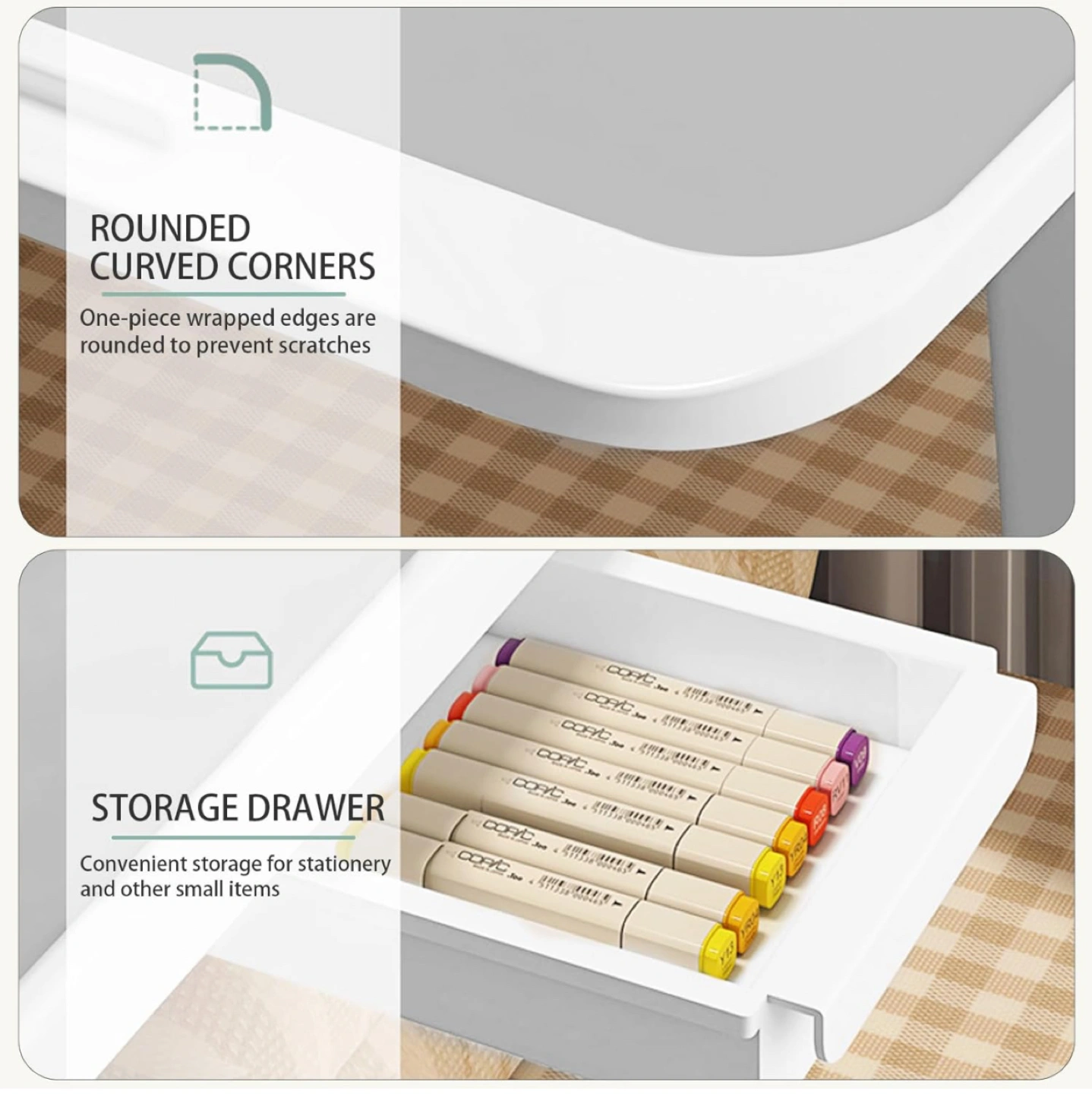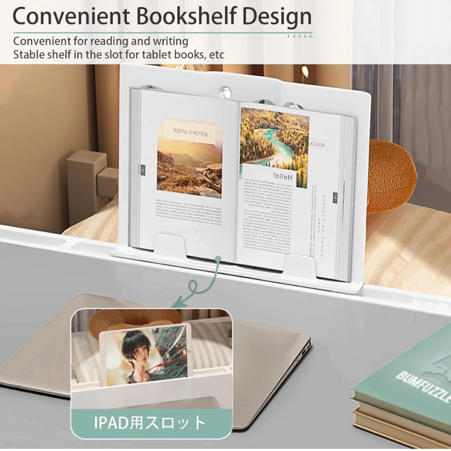 The laptop desk for bed is equipped with a storage drawer, tablet slot, pen slot, phone stand and book stand.