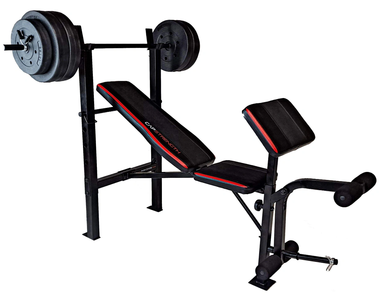The Cap Barbell Adjustable Utility Weight Bench for Full Body Workout with 100-lb Weight Set features a compact design, with a convenient five-position back pad and full leg workout facilities.