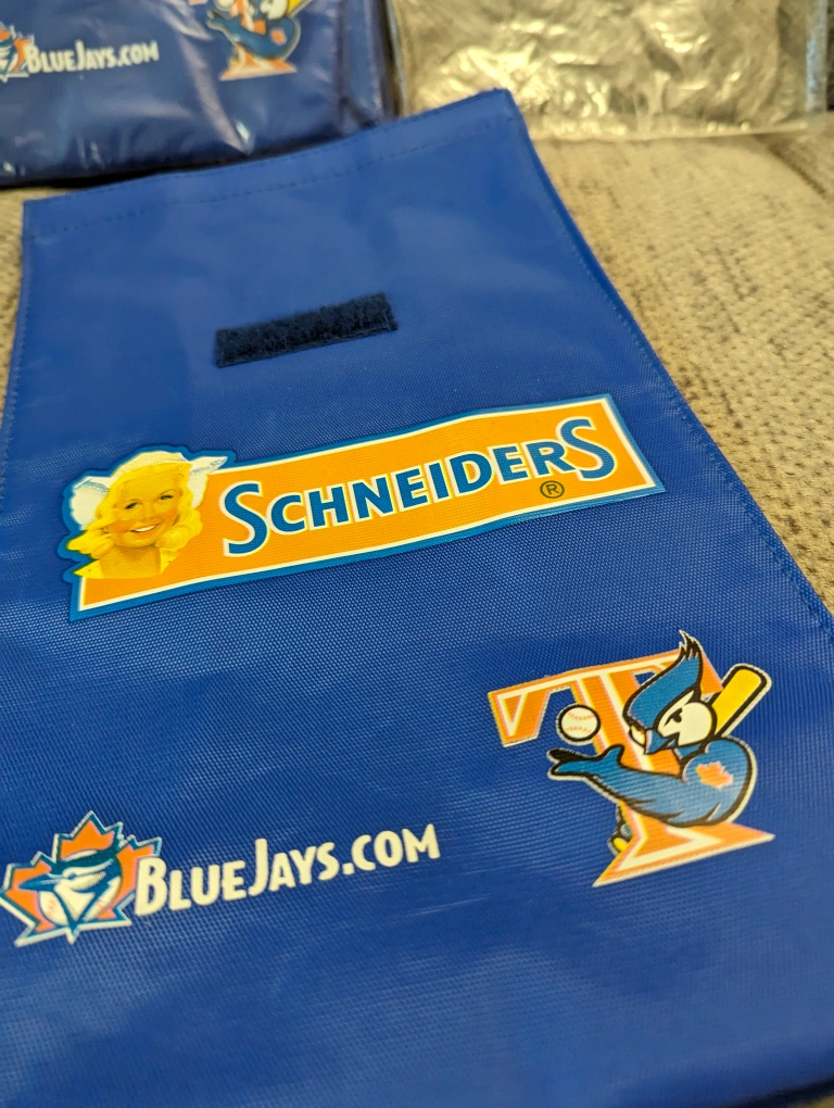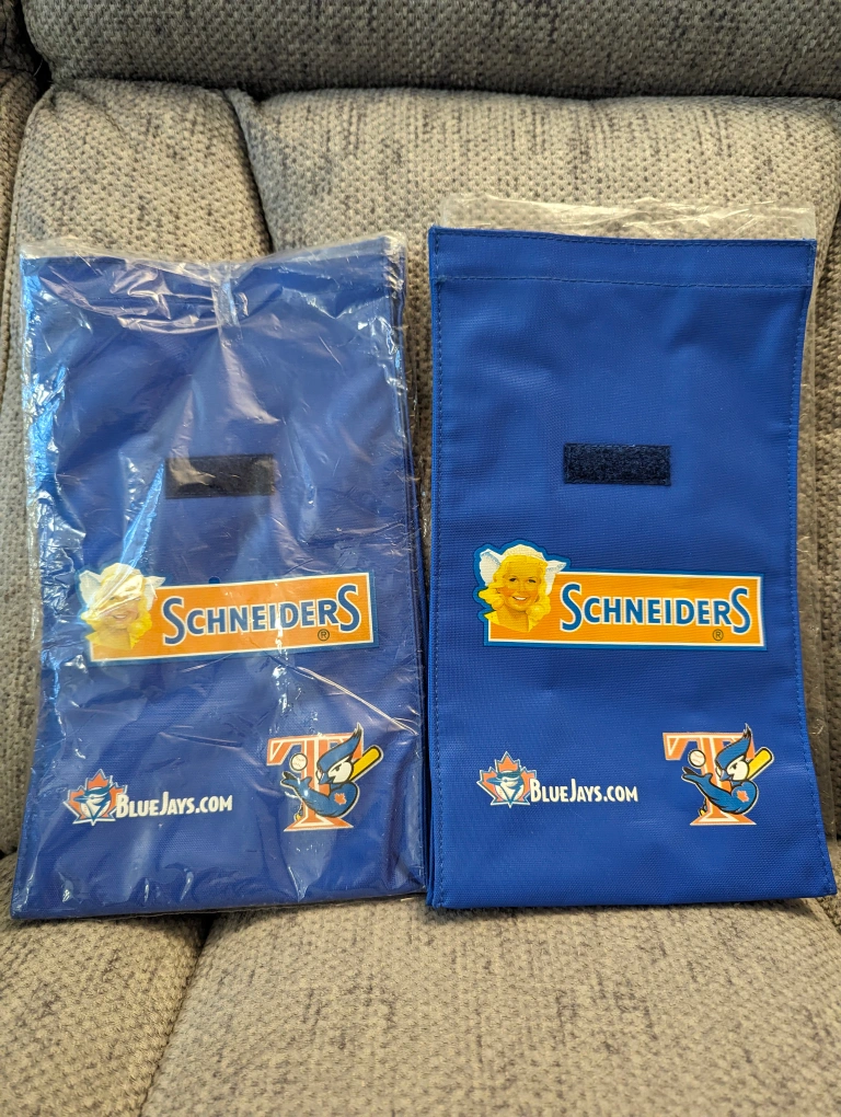 Both lunch bags are new, never been used and have been kept in plastic bags the majority of the time. They have two versions of the old Blue Jays logos, Schneider's logo and their website shown on the front side of the bags. They were a stadium giveaway (SGA) item.