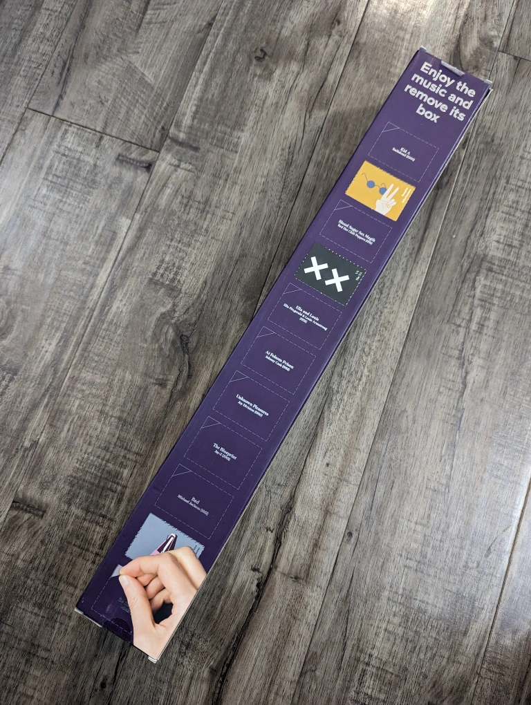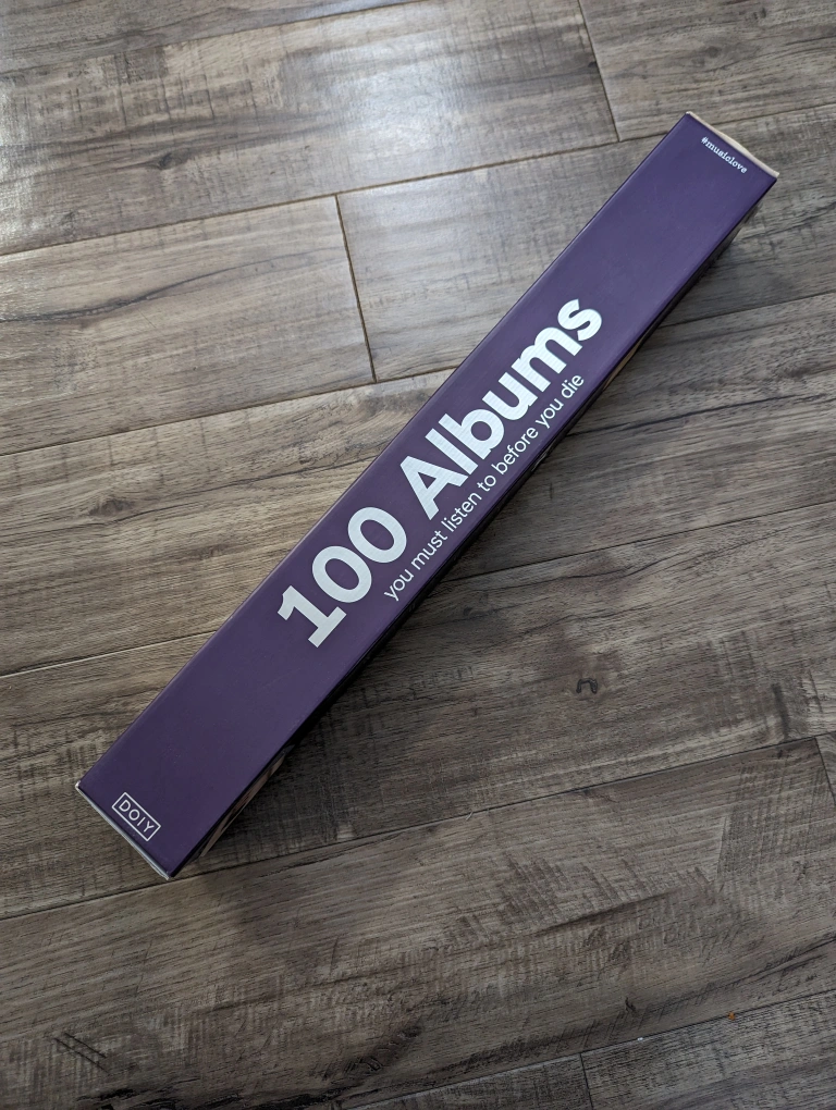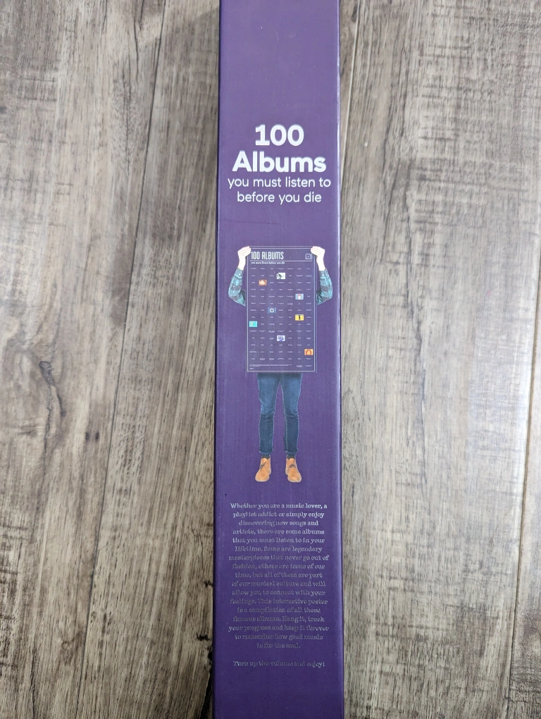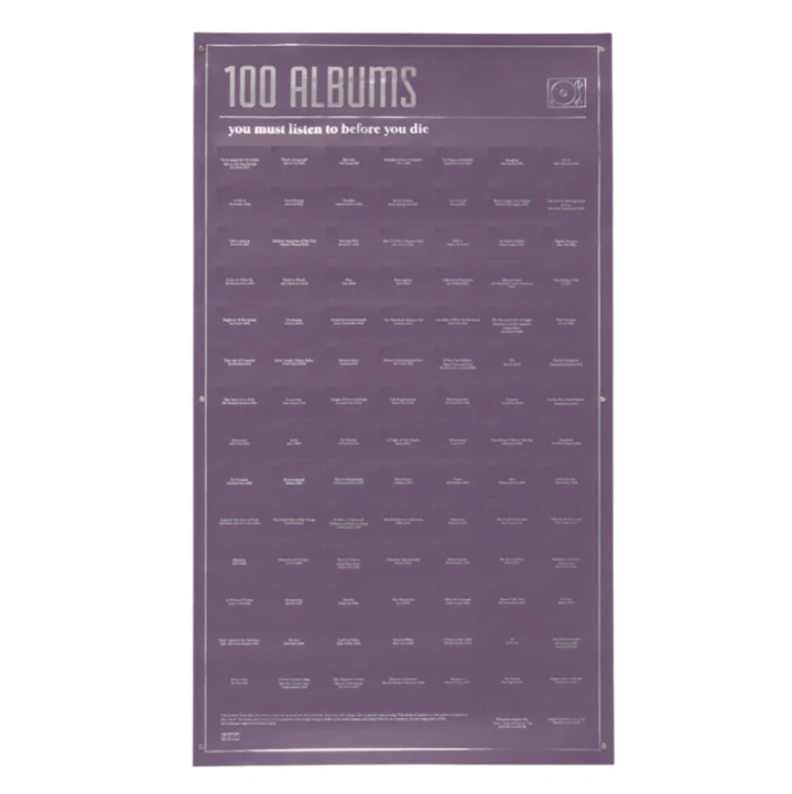 Hang it up, listen to one of the 100 albums on the chart, and rip the label off to reveal the cover art. Simple and satisfying! Track your progress and keep it forever to remember how good music is for the soul.