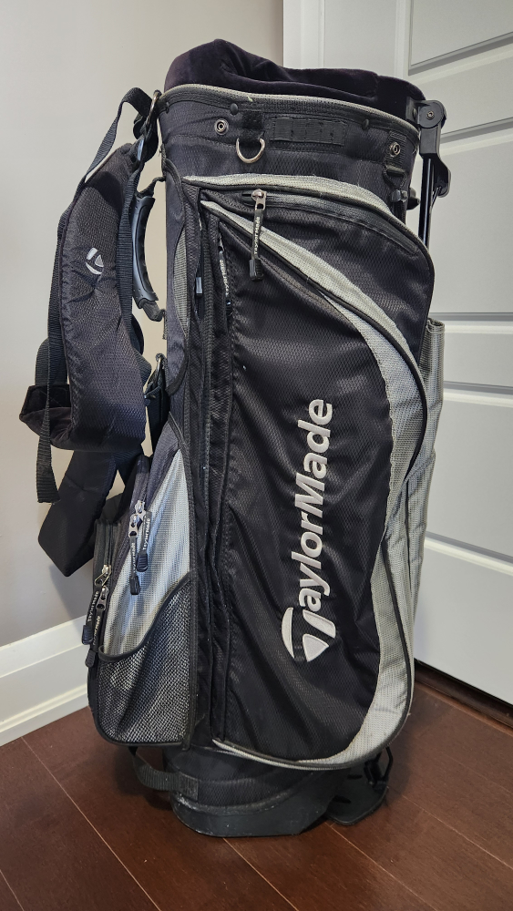 78TaylorMade stand bag with rain hood: - 7-way top with one being a dedicated putter. - 7 zipper pockets (2 large for clothing, 4 for accessories/balls, 1 with soft lining for valuables like keys, phone, and wallet. - 3 mesh pockets for drinks. - 1 Umbrella slot. - Black with greyish/silver accents. Bag in great condition with all zippers working and no rips. Asking $150.