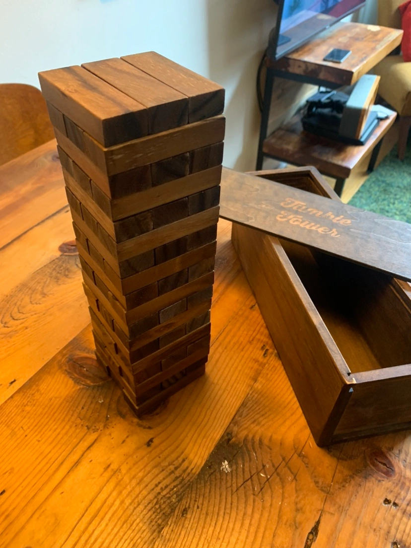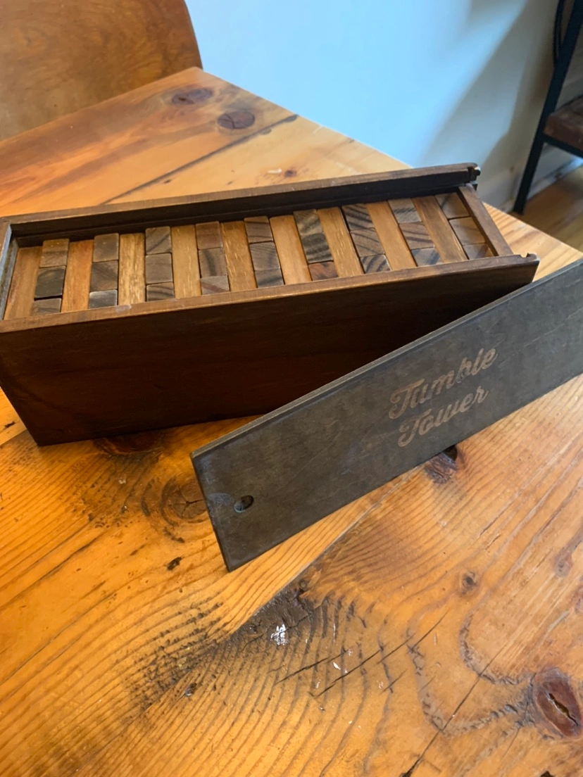 Tumble tower game made of wood!. Removable panel on the side and bottom of box. Great for hosting games nights!