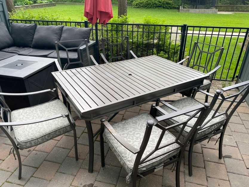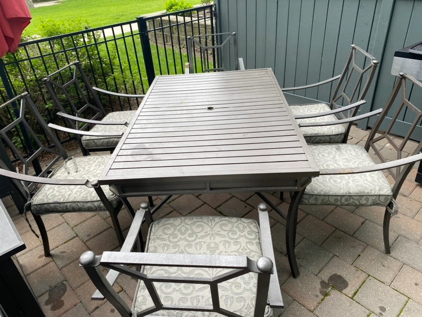 Free patio set- includes table, 6 chairs, and 6 cushions. Table and chair have rust, you can paint and make them look like new. Must pick up today