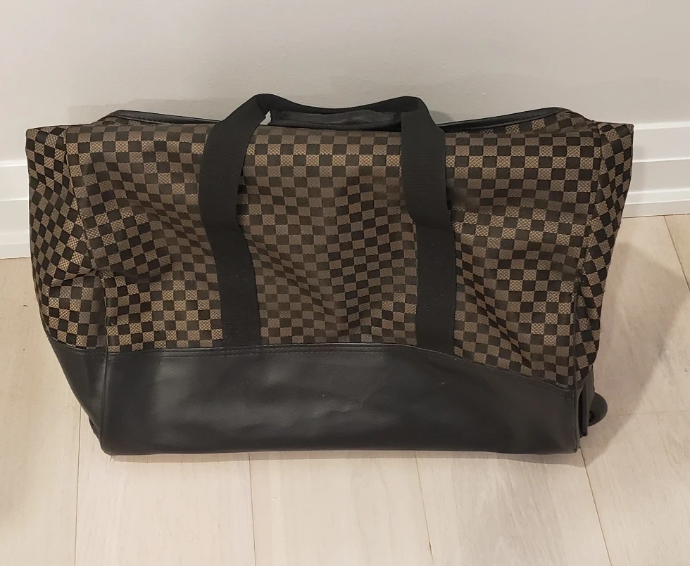 Lightweight, spacious, wheeled duffel trolley bag used a few times only. This bag has mostly been in storage for a few years and there are some fraying at the edges near the wheels as shown in the last 2 pictures. But this will not affect the function and the tears don't reach inside.